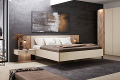Schaffen Sie sich Ihre ganz persönliche Wohlfühloase ... mit der Bettanlage aus dem Schlafraum-Einrichtungsprogramm Plan von Thielemeyer. Hier dominieren helle Lackoberflächen im edlen Farbton Champagner und Absetzungen aus Spaltholz in Form der Paneele setzen gekonnt natürliche Akzente. Die insgesamt etwa 322 cm breite Bettanlage schafft mit ihrer hellen Lackausführung eine gemütliche, freundliche Atmosphäre und erhält durch das authentische Spaltholz einen Akzent mit rustikal wirkender Oberfläche, die auf gelungene Weise eine Verbindung zur Natur herstellt. Lassen Sie sich einfach auf der 180 x 200 cm großen Liegefläche fallen und genießen Sie die harmonische Umgebung, die es Ihnen leicht macht, sich zu entspannen. Sie wünschen sich eine dezente aber wirkungsvolle Beleuchtung für Ihr neues Bett? Bestellen Sie über unsere Zusatzoptionen die LED-Spots für die Paneele und/ oder die LED-Unterbau-Beleuchtung für die beiden Nachtkonsolen und tauchen Sie die Bettanlage so in ein angenehm sanftes Licht. Das Bett Plan von Thielemeyer mit seinen beiden hängenden Nachtkonsolen und den ansprechenden Paneelen hat ein modernes Design, das Eindruck hinterlässt.