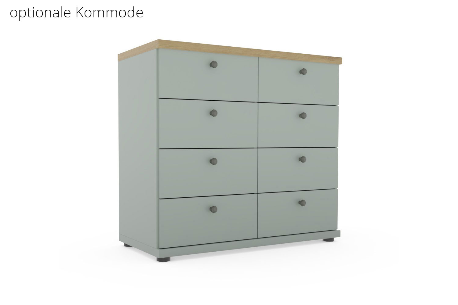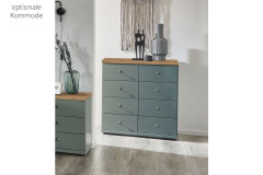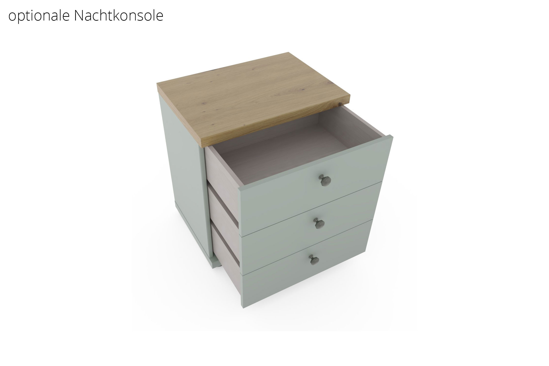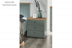 Das Landhaus-Bett der Schlafzimmerserie Marlow von Wiemann verfügt über ein stiltypisches Kopfteil mit Kassettenoptik und präsentiert sich hier in der Trendfarbe Salbeigrün mit Absetzungen in Form einer Bianco-Eiche-Holznachbildung. Diese Kombination sorgt aufgrund ihres gedämpft erdigen und neutralen Erscheinungsbildes für eine entspannte, gemütliche Atmosphäre. Bestimmen Sie mithilfe der Zusatzoptionen die für Sie geeignete Liegeflächengröße des Bettes und fügen Sie ganz nach Bedarf den passenden Nachtschrank und/ oder die Kommode mit vier Auszügen zum Angebot hinzu. Gern können Sie die Möbel auch in einer alternativen Farbausführung wählen. Für die ausgesuchte Bettgröße geeignete Lattenroste und Matratzen finden Sie im Möbel Letz Online-Shop in der Kategorie Bettzubehör. Entdecken Sie im Typenplan und im Prospekt unter Downloads die Marlow Möbelvielfalt und lassen Sie sich inspirieren. Ihre individuelle Wunsch-Konfiguration können Sie telefonisch oder via Kontaktformular bei unseren Einrichtungsexperten bestellen.