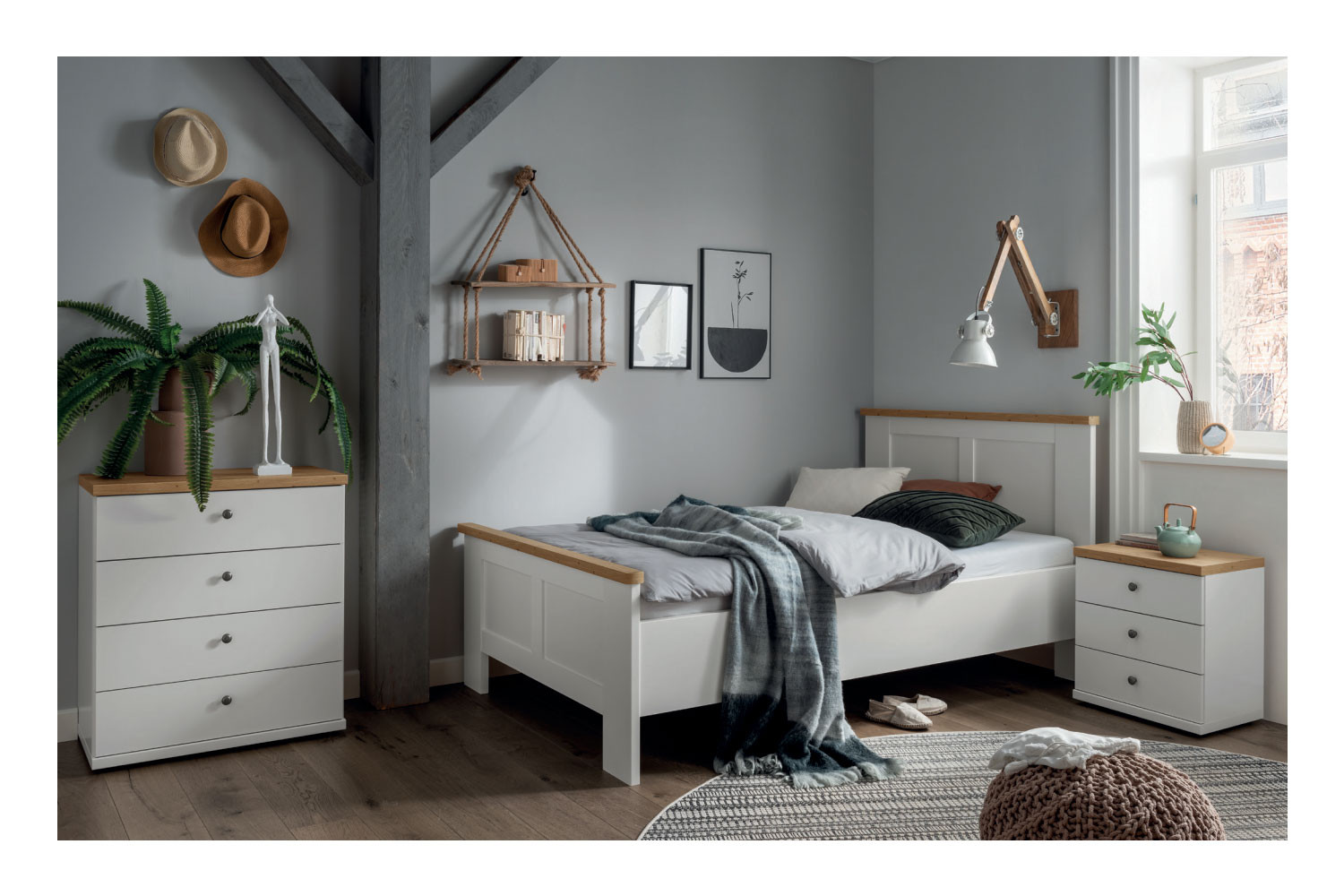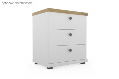 Im modernen Landhaus-Design zeigt sich das Komfort-Einzelbett aus dem Wiemann Schlafraum-Programm Marlow. Klassisches Weiß und dezente, naturgetreue Absetzungen in einer Bianco-Eiche-Holznachbildung sowie die charakteristische Kassetten-Optik an Kopf- und Fußteil des Bettes unterstreichen das Stilkonzept aus charmanter Schlichtheit und ländlichem Flair. Das Single-Bett der Marlow-Serie ist in zwölf Liegeflächengrößen verfügbar, von denen das großzügige Abmaß 120 x 200 cm vorausgewählt wurde. Über die angebotenen Zusatzoptionen können Sie auch direkt online die passende Nachtkonsole mit drei Auszügen und eine ergänzende, etwa 86 cm hohe Schubkastenkommode, die in zwei Breiten erhältlich ist, zubuchen. Im Möbel Letz Online-Shop stellen wir Ihnen zudem auch Kleiderschränke aus dem Marlow-Modell von Wiemann vor, sodass Sie problemlos eine Schlafzimmer-Grundausstattung zusammenstellen können. Sie benötigen noch einen Lattenrost und eine Matratze für die von Ihnen ausgewählte Bettgröße? Dann schauen Sie sich gern unser umfangreiches Bettzubehör-Sortiment an und suchen Sie sich die für Ihre individuellen Bedürfnisse geeigneten Elemente aus.