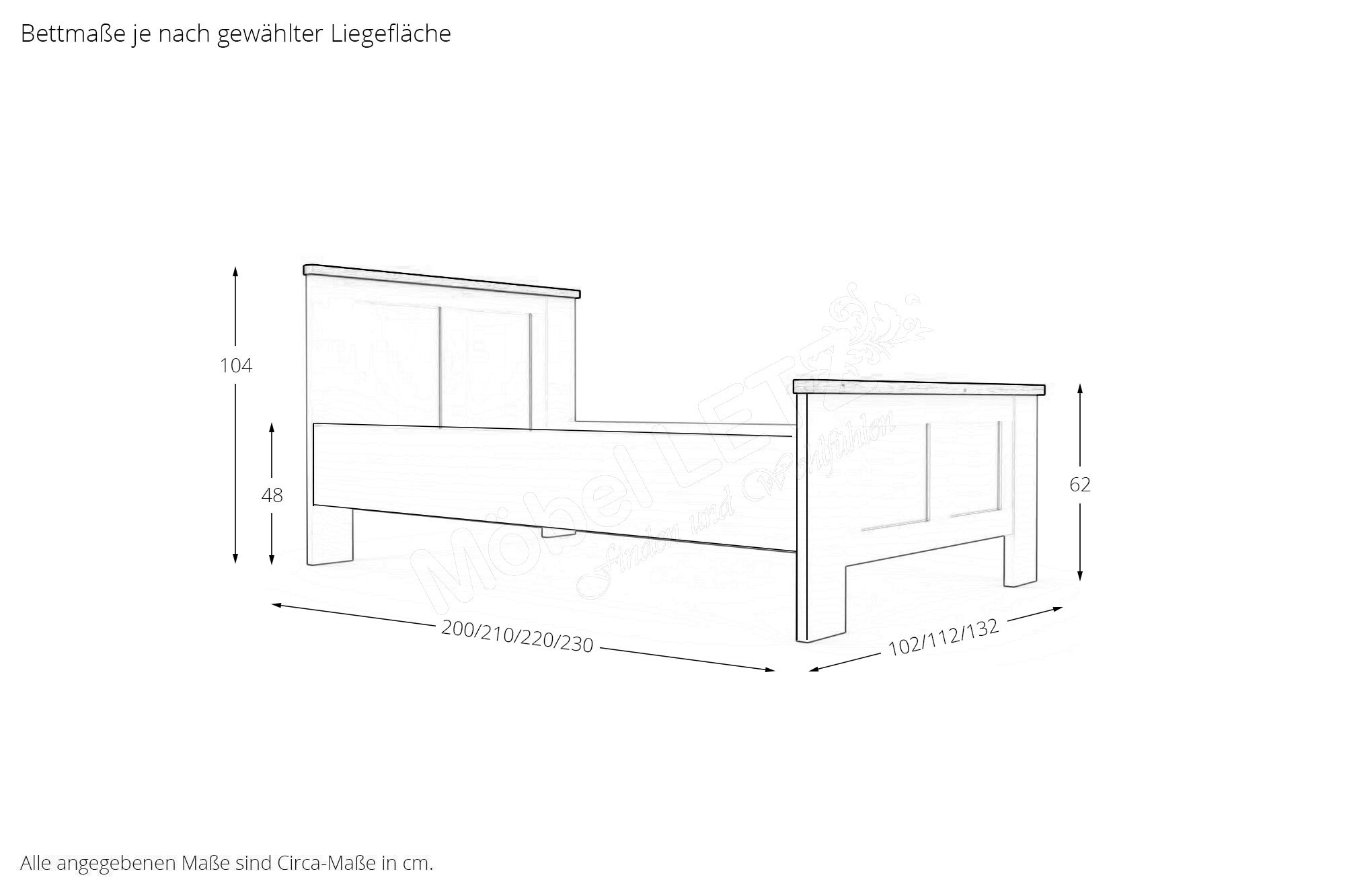 - Bett: Höhe Kopfteil ca. 104 cm, Höhe Fußteil ca. 62 cm, Höhe Oberkante Bettseite ca. 48 cm