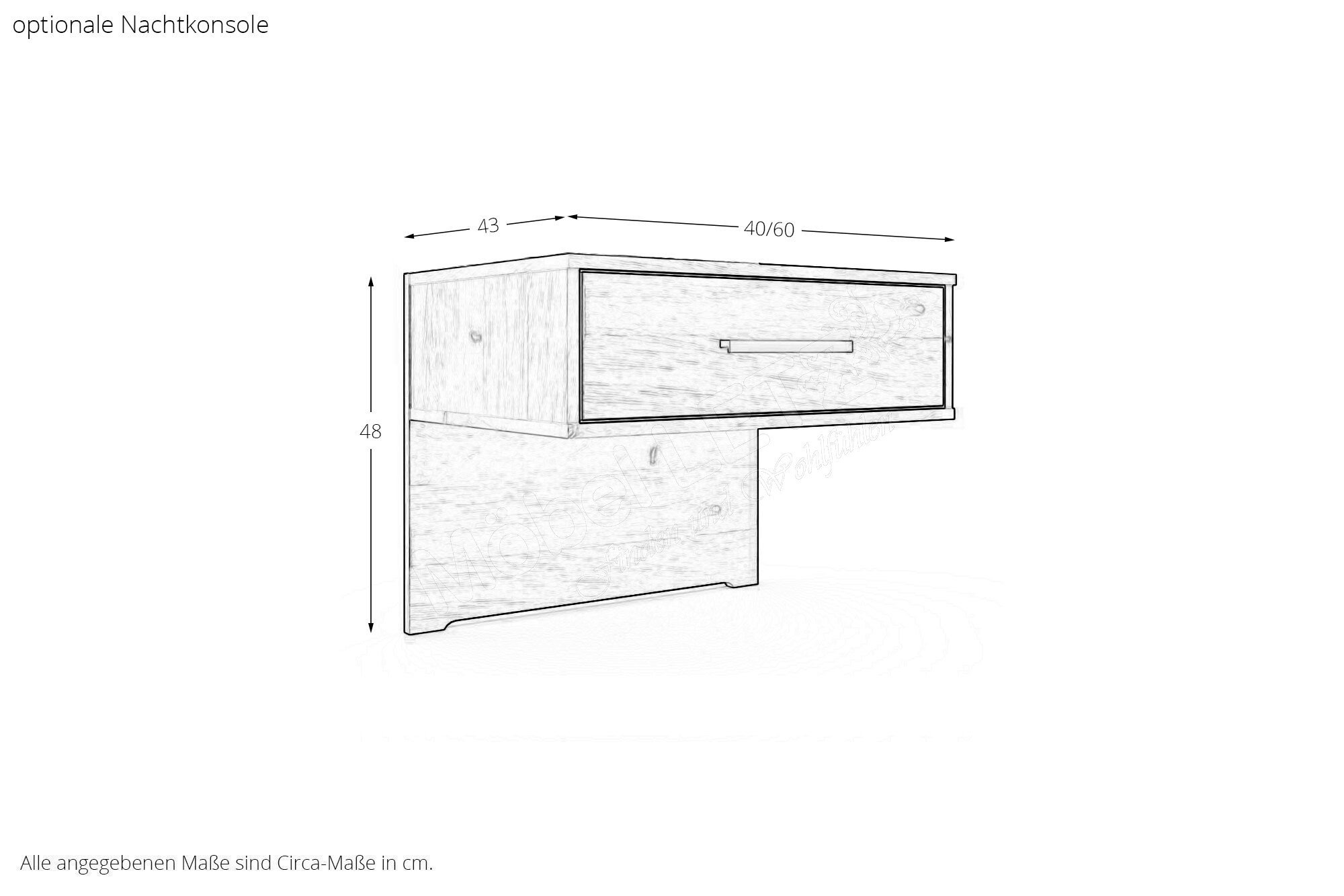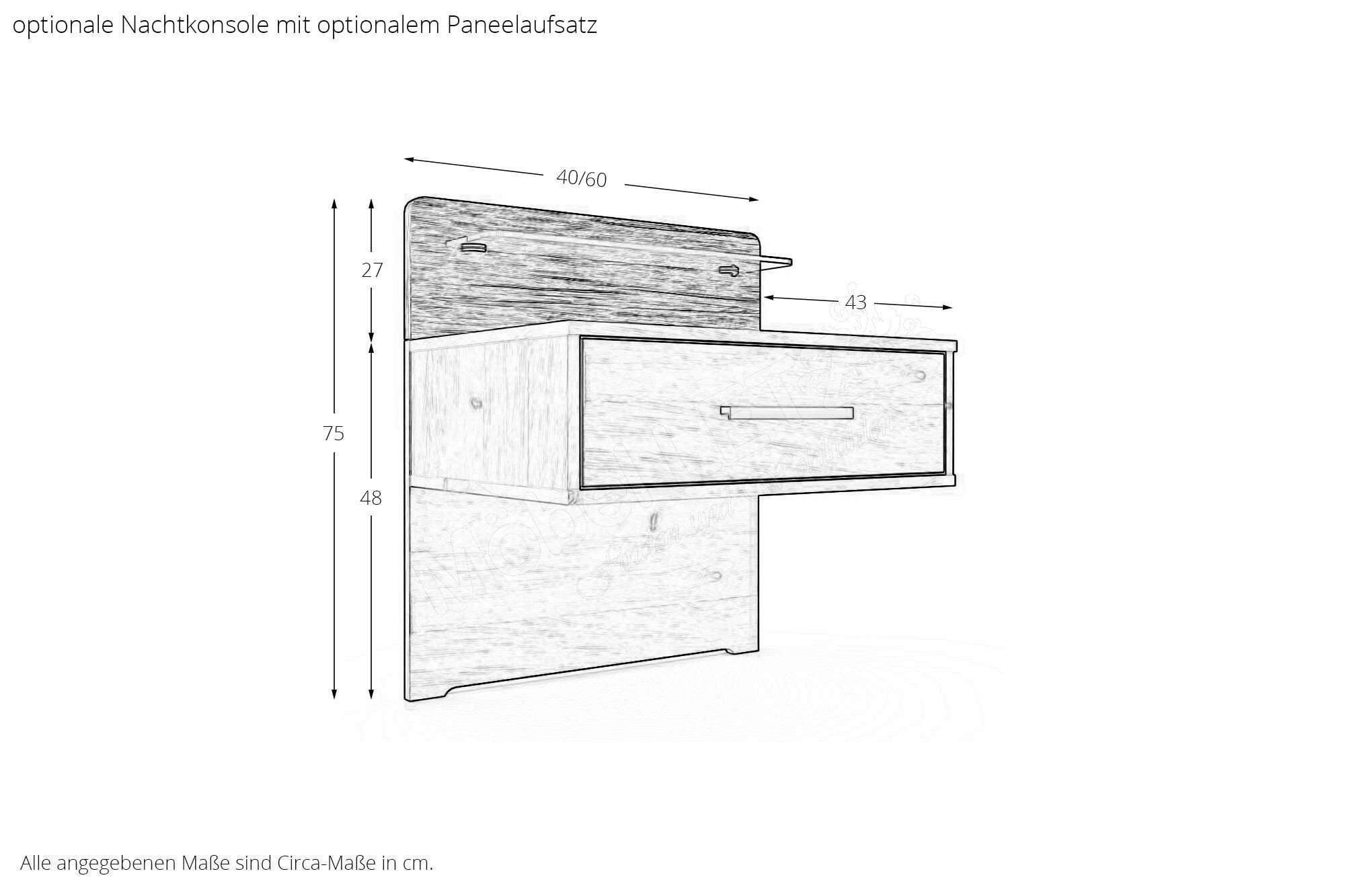 - Bett: Höhe Kopfteil ca. 97 cm, Höhe Fußteil/ Oberkante Bettseite ca. 48 cm