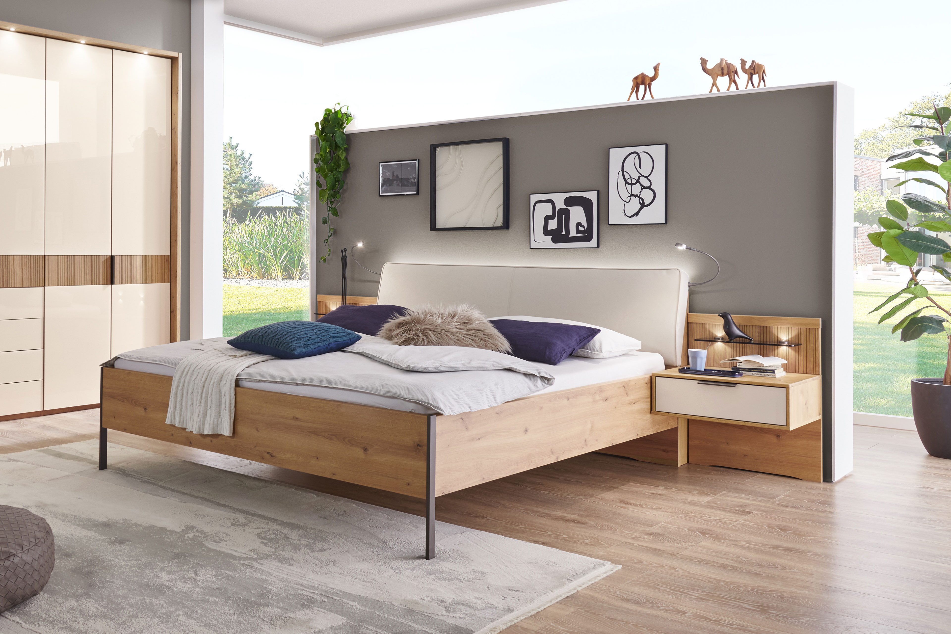 Bei den Möbeln der Serie Valetta von Wiemann verschmelzen klassische und moderne Elemente zu einer harmonischen Einheit. Ein Bettrahmen, dessen Fußteil aus Massivholz besteht und dessen Seitenteile mit einer authentischen, ressourcenschonenden Bianco-Eiche-Holznachbildung aufwarten, schieferfarbene Metallfüße und ein bequemes, champagnerfarbenes Kunstleder-Polsterkopfteil bilden das Doppelbett, das unser Grundangebot darstellt. Die Liegefläche kann ganz nach Bedarf bestimmt werden. Dafür stehen Ihnen insgesamt zwölf Größen in den Zusatzoptionen zur Wahl. Komfortable Leseleuchten, eine kuschelige Ambiente-Beleuchtung für das Kopfteil oder auch eine praktische Fußraum-Beleuchtung sind ebenfalls zubuchbar. Als Ergänzung zum Bett bieten wir Ihnen auch gleich die passenden Nachttische mit je einem Schubkasten als Stauraum-Option an. Die Massivholz-Nachtschrank-Paneel-Aufsätze, die sich aufgrund der vertikalen Rillen-Optik im eleganten Retro-Chic präsentieren, sind auch wählbar. Nun fehlen Ihnen nur noch die passenden Lattenroste und Matratzen? Dann werden Sie in unserem umfangreichen Sortiment der Kategorie Bettzubehör im Möbel Letz Online-Shop sicherlich fündig.