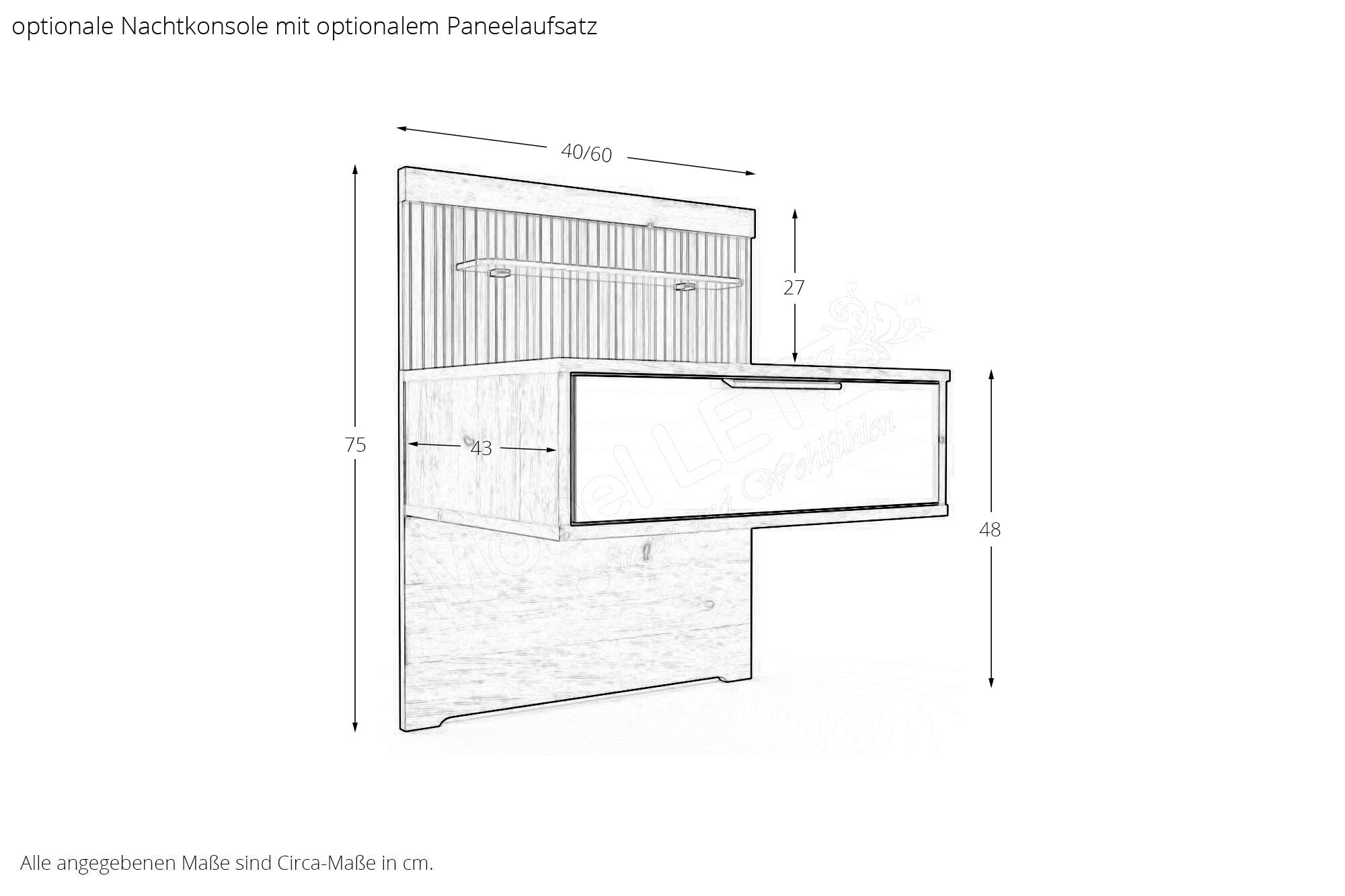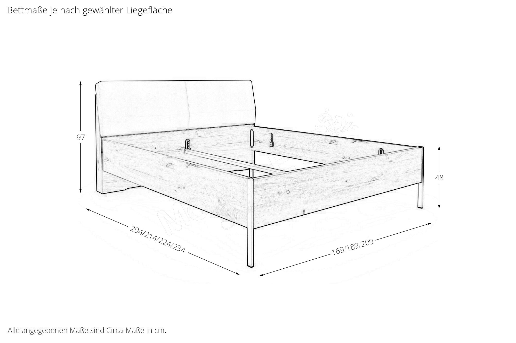 - Bett: Höhe Kopfteil ca. 97 cm, Höhe Fußteil/ Oberkante Bettseite ca. 48 cm