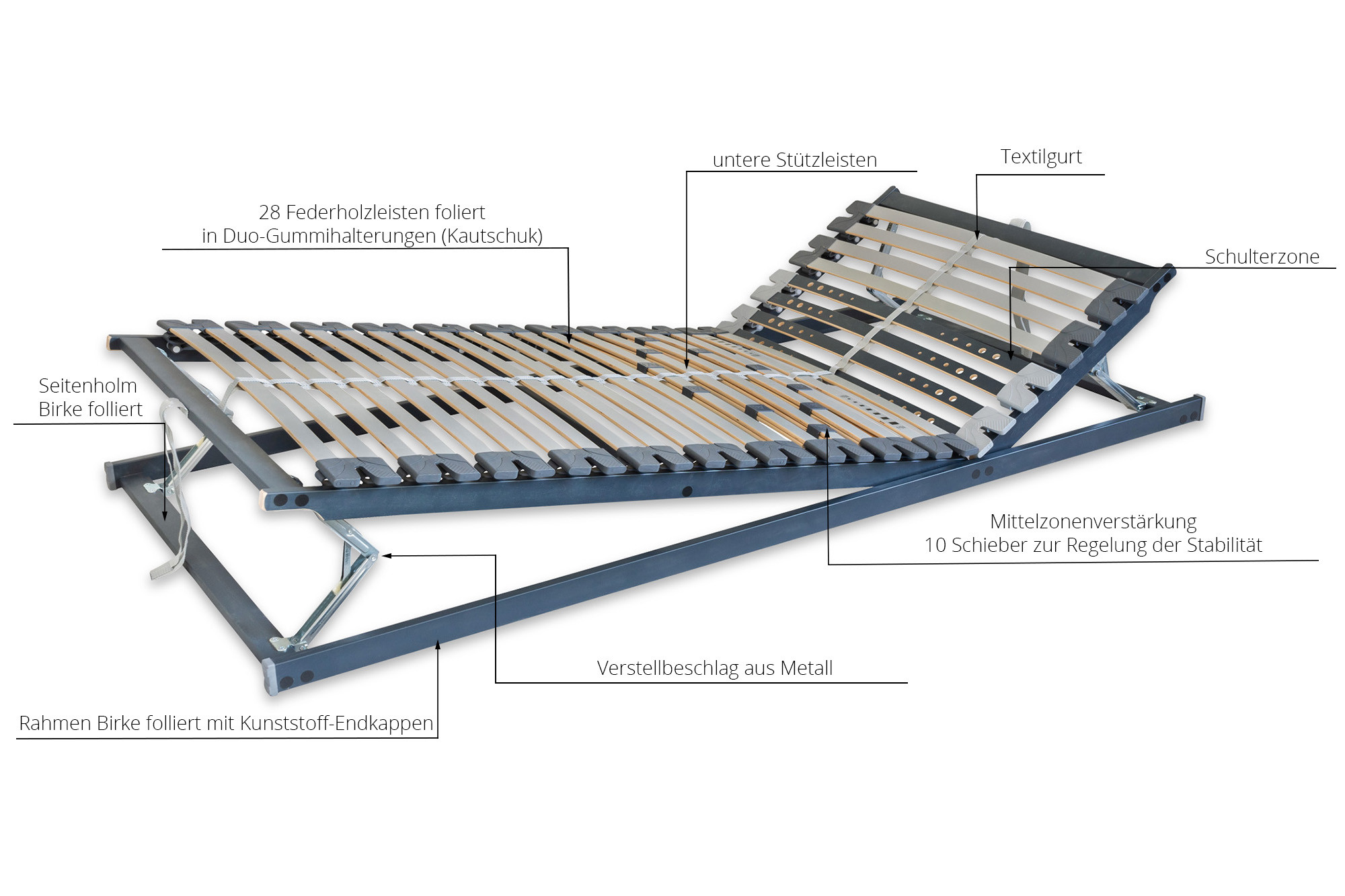 - Federleisten: 28 Federleisten, 24 folierte Federholzleisten (silber) aus Birke + 4 folierte Federholzleisten (anthrazit) in Duo-Gummihalterungen, 5 Stützleisten (Schulterzone), Textilgurt