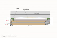 - Lattenrost: 28 Federleisten mit Folie, gelagert in hochwertig schwingend-federnden Duo-Kautschuk-Kappen mit doppelter Festigkeit, 7 anatomische Zonen, gefräste Federleisten in der Schulterzone, 6-fache Mittelzonenverstärkung (Härtegradeinstellung) im Beckenbereich und ein stabilisierendes Mittelband