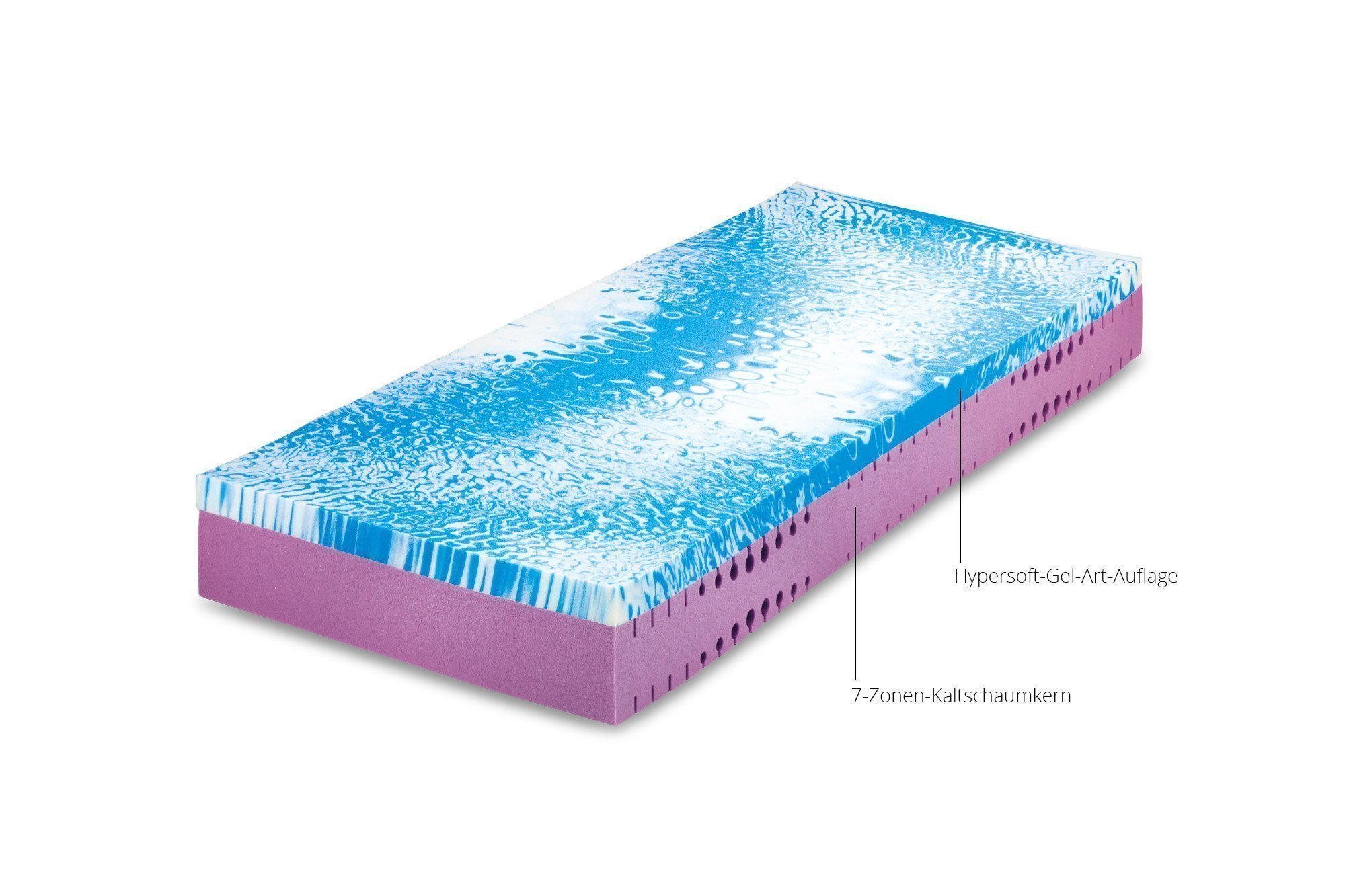 - Kern: 7-Zonen-Kaltschaum-Kern (Höhe ca. 15 cm) mit ca. 6 cm Hypersoft-Gel-Art-Auflage