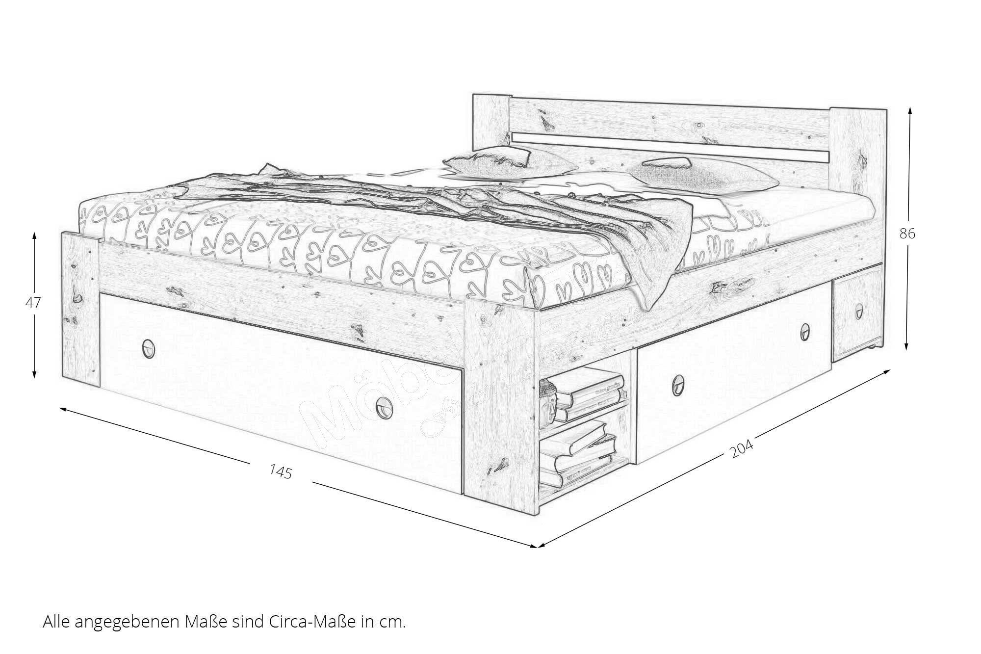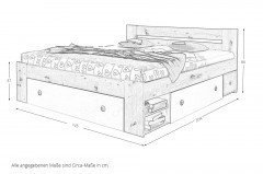 - Bett: Futonbett, Rahmenhöhe ca. 47 cm, Einlegetiefe ca. 9,5 cm (nicht verstellbar), Materialstärke Rahmen ca. 18 mm, Abstand Boden bis Unterkante Seite ca. 31,5 cm, 4 offene Fächer (nicht verstellbar, je ca. 41 x 16 cm), 2 große seitliche Schubladen (Innenmaße BHT je ca. 111/25,5/63,4 cm), 1 Schublade am Fußende (Innenmaß BHT ca. 100,5/25,5/39,5 cm)