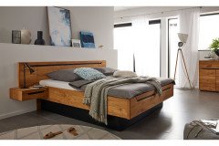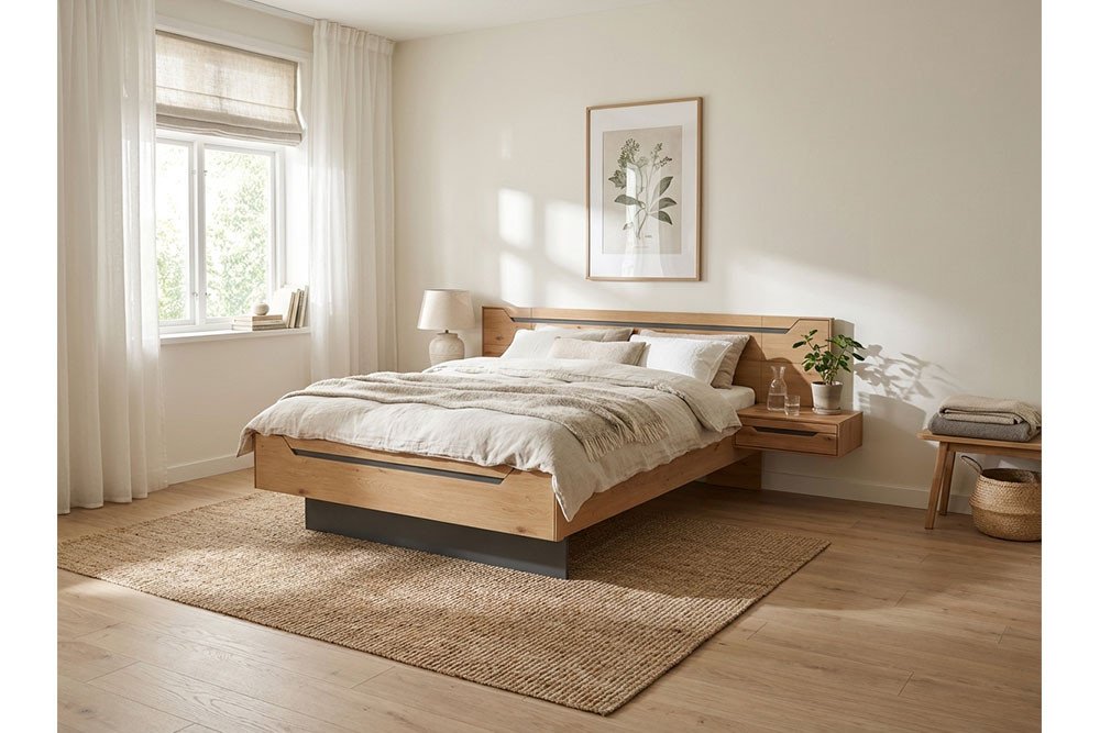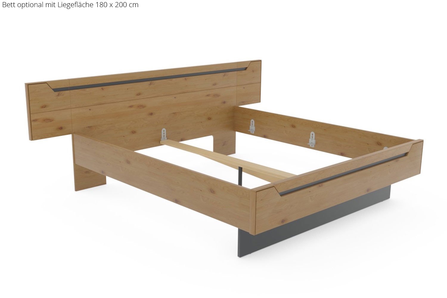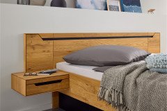 Erleben Sie mit diesem Massivholzbett von Decker Möbelwerke zeitlose Eleganz und kompromisslose Qualität in Ihrem Schlafzimmer. Das Modell InCasa Onema wird aus hochwertiger Wildeiche oder wahlweise aus charakterstarker Kernbuche gefertigt und überzeugt durch natürliche Ausstrahlung und langlebige Stabilität. Die lebendige Maserung und die geölte Oberfläche bringen die besondere Struktur des Holzes stilvoll zur Geltung. Das markante Kopfteil mit seitlichem Überstand setzt ein modernes Designstatement und lädt zum entspannten Anlehnen ein. Feine Zierausfräsungen in Schwarz, alternativ Ton in Ton in Holz, verleihen Kopf- und Fußteil eine elegante Raffinesse. Die vordere Fußteil-Wange lässt sich harmonisch in Schwarz oder in natürlicher Holzoptik gestalten. Für zusätzlichen Stauraum und mehr Ordnung im Schlafzimmer kann optional ein praktisches Schubkastenmodul ergänzt werden. Möchten Sie noch mehr Komfort direkt am Bett? Dann lohnt sich der Blick in unsere Zusatzoptionen. Dort finden Sie die abgebildete Hängekonsole mit Schubkasten, die mit einem komfortablen Vollauszug und gedämpftem Selbsteinzug punktet. Mit viel Sorgfalt gefertigt, überzeugt dieses Holzbett durch eine hochwertige Verarbeitung und präzise Ausführung bis ins Detail. Incasa Onema von Decker- steht für Massivholzmöbel mit Charakter und Ausstrahlung.