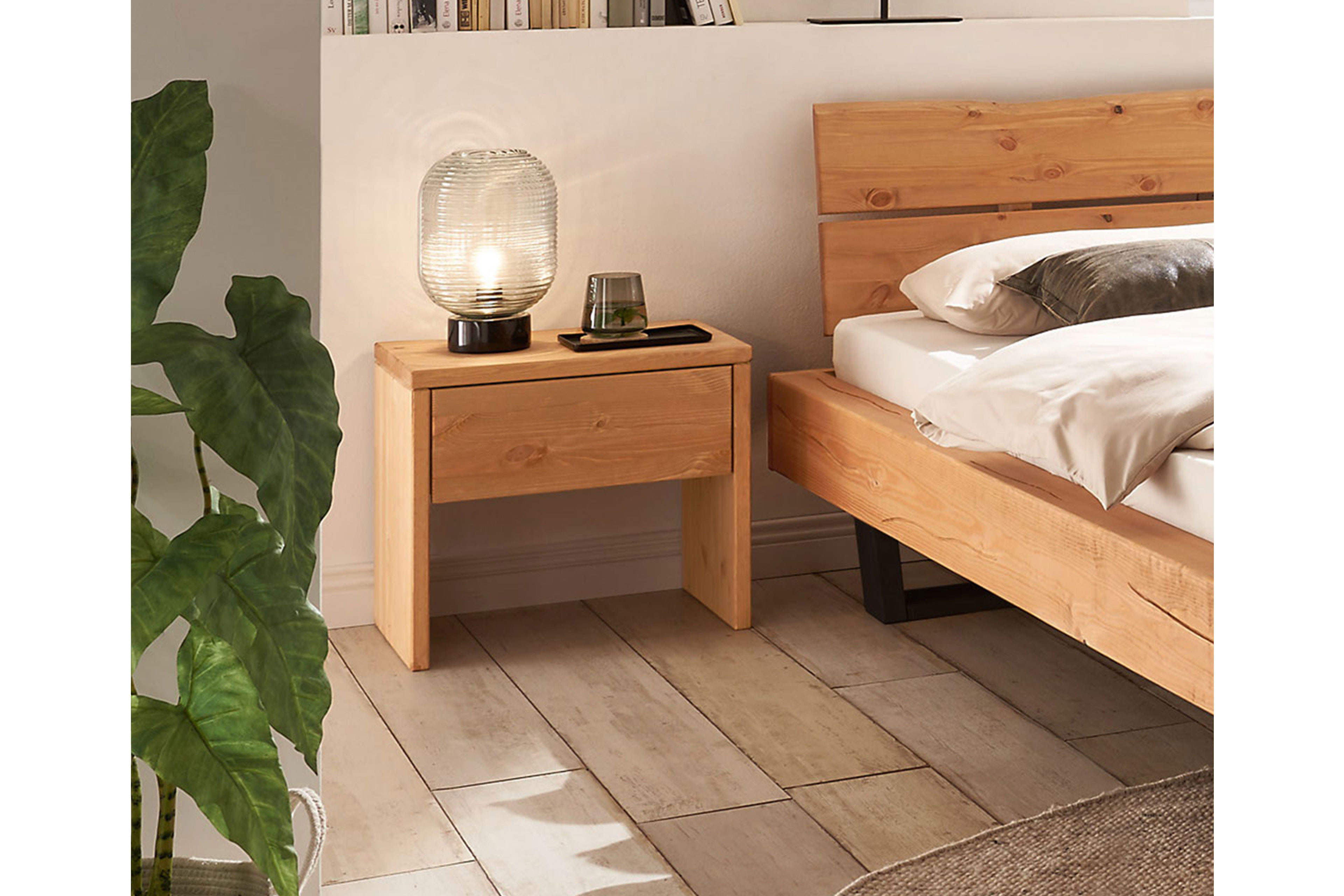 Bringen Sie frischen Wind in Ihr Schlafzimmer und lassen Sie das neue Massivholzbett mit Metallkufen aus der Kollektion BE-0880 von GK-Möbelvertrieb bei Ihnen einziehen! Zwei Materialien verbinden sich hier und zeigen, wie harmonisch der Kontrast aus schwarzem Metall mit hellem Kiefernholz wirken kann. Das Design ist auf das Wesentliche reduziert und wirkt dadurch besonders zeitlos. Die wählbare Liegefläche wird von zwei Metallkufen getragen, die dem Bett eine moderne Optik verleihen. Vervollständigt wird der Massivholzbettrahmen von einem zweiteiligen Betthaupt, dessen oberen Rand eine formschöne Baumkante schmückt. Sie wünschen sich noch ein wenig Stauraum in Bettnähe? Dann nutzen Sie gern unsere Zusatzoptionen. Hier finden Sie die abgebildeten Nachtkonsolen, die auf Wunsch gern das Angebot komplettieren. Diese bieten Ihnen neben einem Schubfach für ein Buch oder kleine Gegenstände, ebenfalls eine Ablagefläche für Ihre Brille oder Ihr Smartphone. Natürliche Möbel für ein wohngesundes Zuhause – mit BE-0880 von GK Möbelvertrieb.