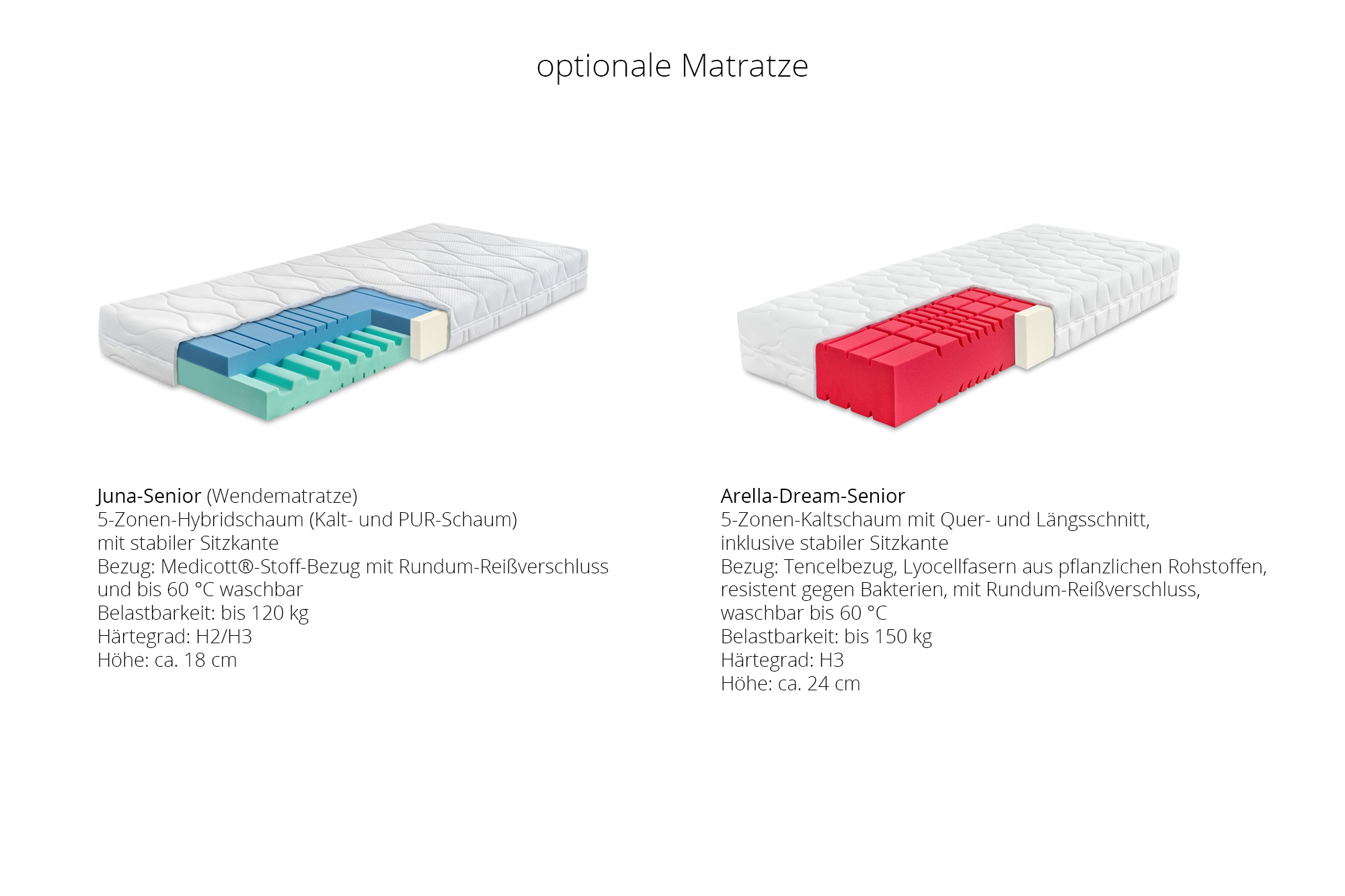 Juna-Senior Wendematratze - 5-Zonen-Hybridschaum (Kalt- und PUR-Schaum) mit stabiler Sitzkante, Härtegrad H2/H3, Medicott®-Stoff-Bezug mit Rundum-Reißverschluss und bis 60 °C waschbar, belastbar bis 120 kg, Höhe: ca. 18 cm