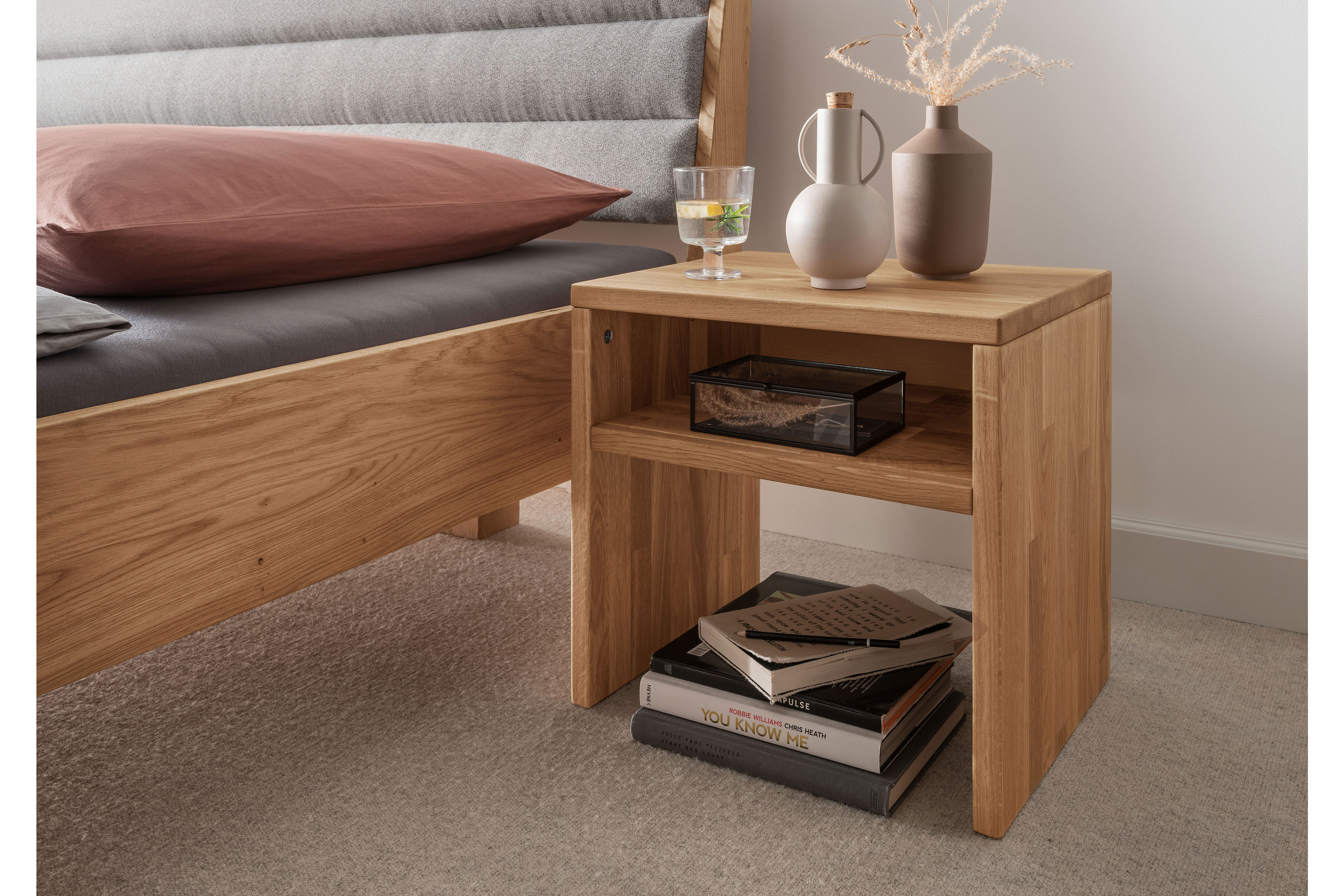 Eine Nachtkonsole, die alles mitbringt, was Sie brauchen. Die Serie BE-0828 von GK Möbelvertrieb kombiniert natürliche Materialien mit einer sorgfältigen Verarbeitung und einem klaren Design, um vielseitige Beimöbel zu kreieren, die sich in jeden Wohnstil integrieren lassen. Genau das trifft auch auf den Nachttisch zu, den wir Ihnen hier vorstellen. Ein massiver Korpus aus Wildeichenholz verbindet sich mit einem minimalistischen Design. Form und Struktur verschmelzen so zu einem Möbelstück, das sich ausgezeichnet als Ergänzung zu Ihrem Bett eignet. Die Standkonsole hat ein offenes Fach. Dort können Sie ein Buch, eine Brille oder andere kleine Dinge ablegen und aufbewahren, die Sie gern in der Nähe des Bettes haben möchten. Und mit nur einem Griff haben Sie alles schnell zur Hand. Auf dem Oberboden finden eine Lampe, kleine Deko-Schätze und sogar ein Glas Wasser ihren Platz. Schlafzimmermöbel von GK-Möbelvertrieb – gestaltet für Ihren Rückzugsort der Wärme und Gemütlichkeit.