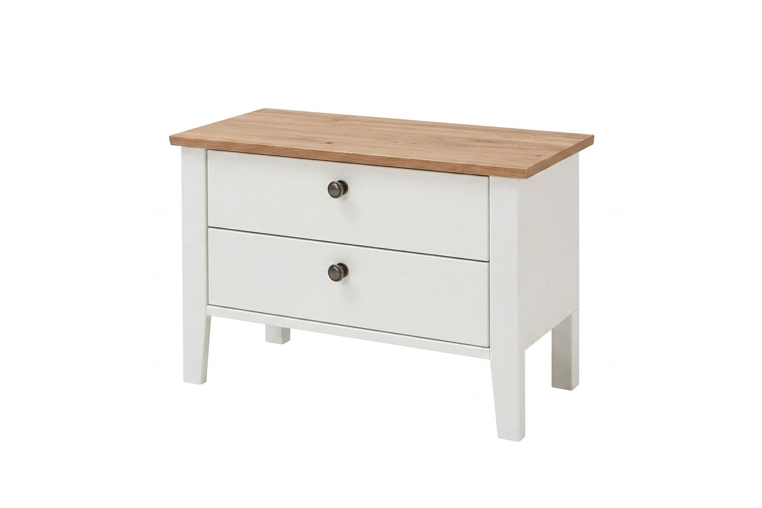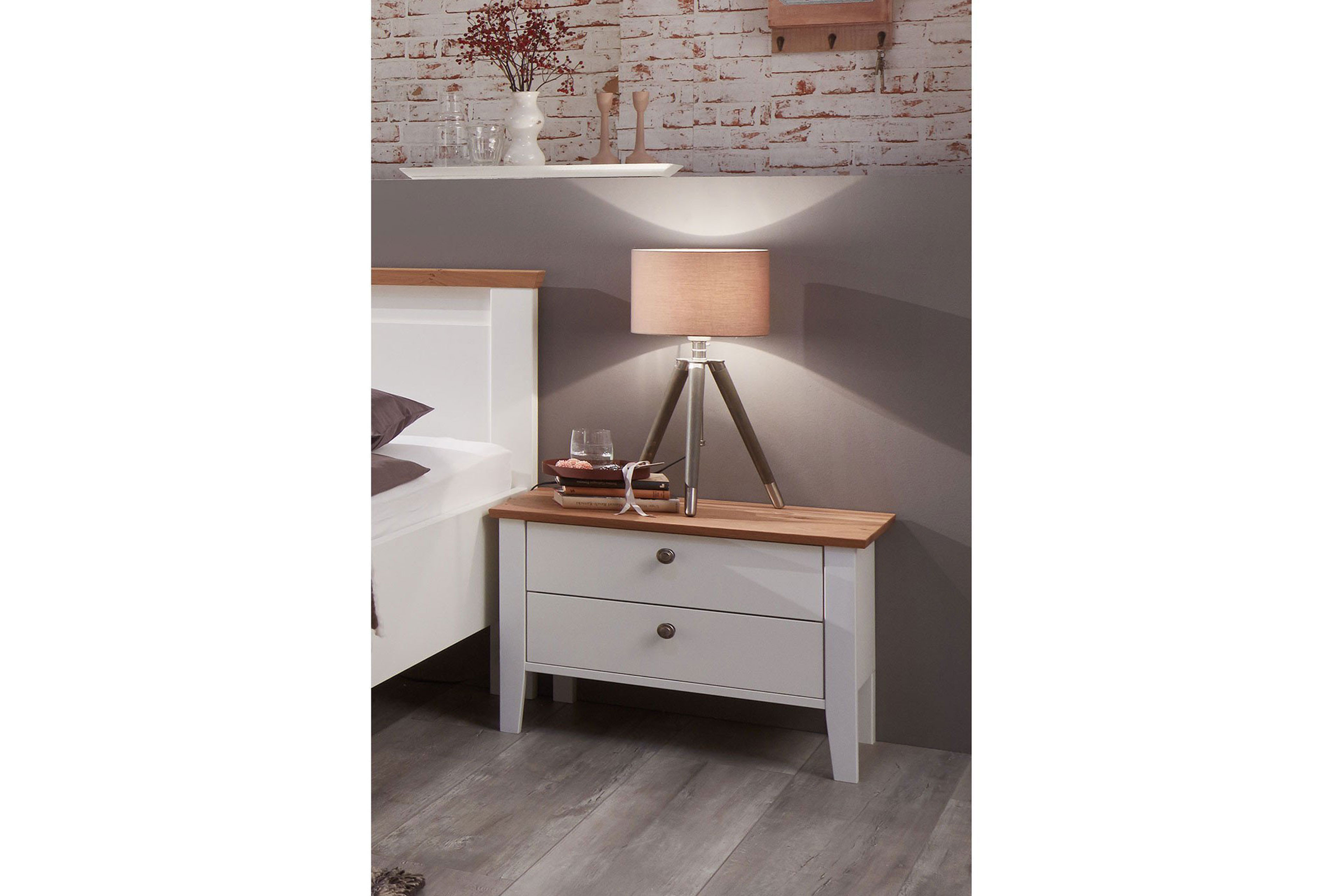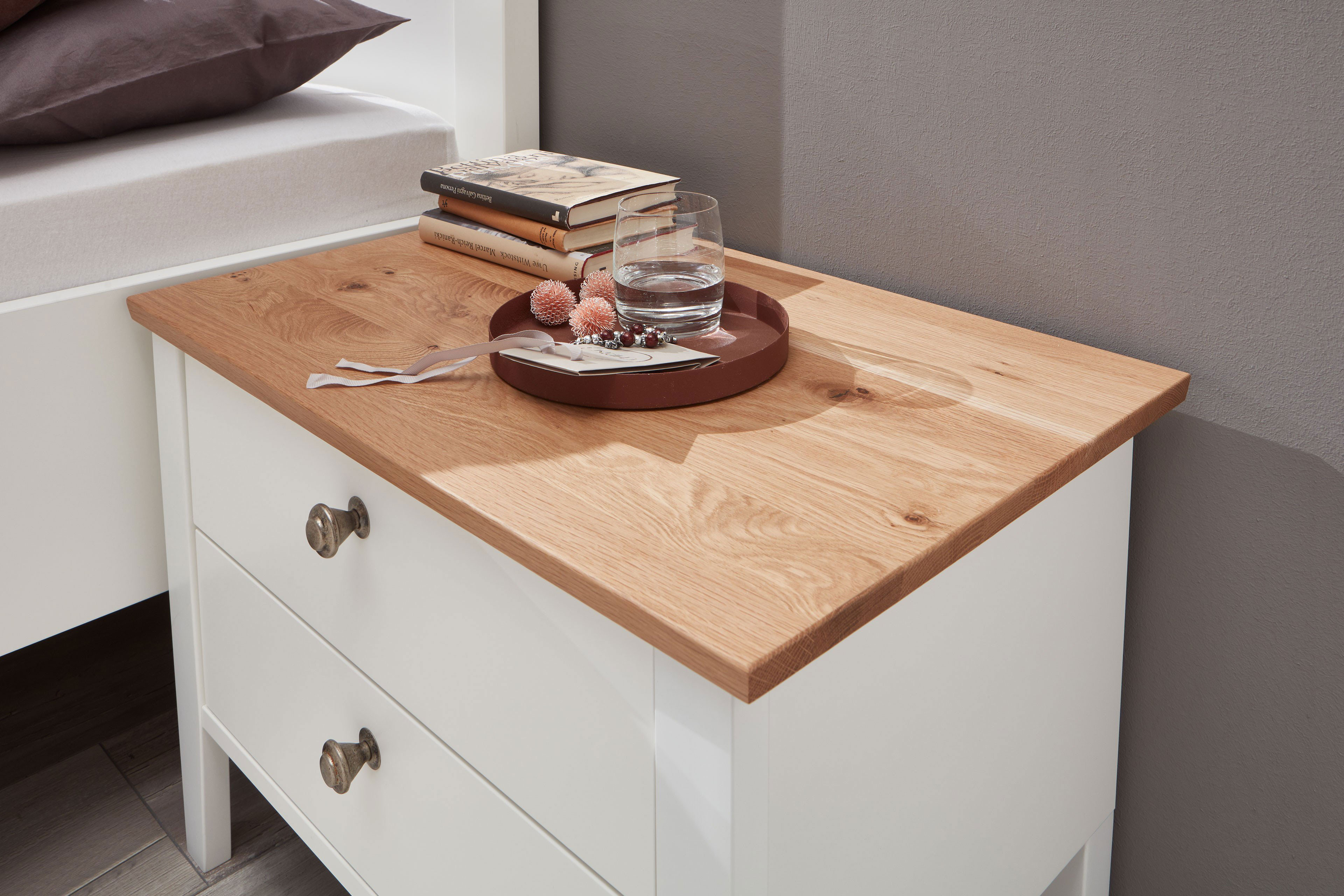 Der allseits beliebte Landhausstil findet im Castellino-Programm von Disselkamp eine moderne Neuinterpretation. Gut zu sehen am Beispiel der Nachtkonsole, die sich in der hellen, lackweißen Ausführung zeigt. Einen gelungenen Kontrast erhält das Möbelstück durch den Abdeckboden, der mit Echtholz in Wildeiche furniert ist. Die seitlich abgeschrägte Form und der versetzte Überstand zum Korpus sowie die nach innen leicht angeschrägten Füße sind typische Merkmale des zeitlosen Einrichtungsstils. Ausgestattet mit zwei Schubladen erhalten Sie ausreichend Stauraumfläche für Taschentücher, Wecker & Co. Geöffnet werden die Schubkästen mittels der Knopfgriffe, die aus Metall sind und leicht antikisiert erscheinen. Die Schubladen laufen über langlebige Unterboden-Metallführungen und schließen zudem leicht, dank dem integrierten Selbsteinzugs- und Softabstoppungs-Mechanismus. Castellino von Disselkamp - Design, das Ruhe und Wärme vereint.