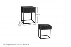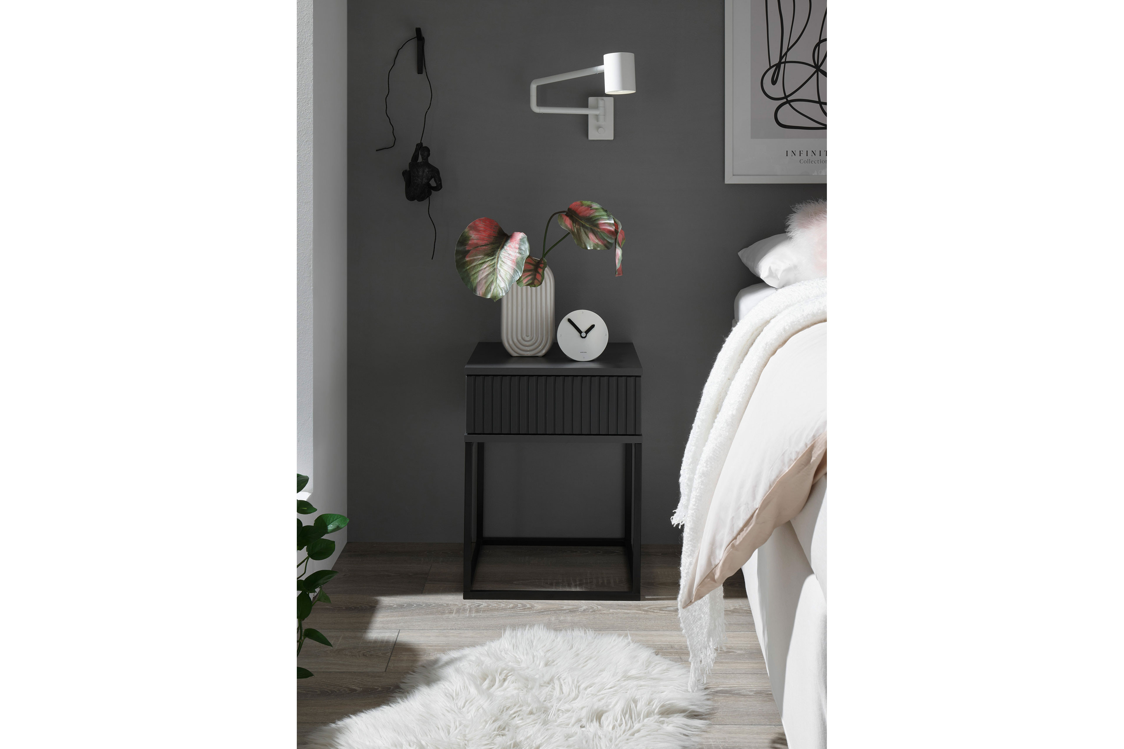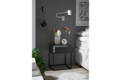 Der POL Power Nachttisch Marle vereint zeitgemäßes Aussehen mit praktischen Details und passt gut zu vielen verschiedenen Schlafzimmerstilen. Die Schubladenfront mit schöner Rillenstruktur verleiht dem Möbelstück eine besondere Tiefe und unterstreicht ihren modernen Charakter. Durch die Push-to-open-Funktion kann der Schubkasten ganz einfach und ohne Griff geöffnet werden, sodass die Schubladenfront mit ihrer dekorativen Rillenstruktur besonders gut zur Geltung kommt. Das dunkle Graphit bringt eine edle Note ins Schlafzimmer und harmoniert mit dem schlanken schwarzen Metallgestell. Der Nachttisch ist in anderen Größen und Ausführungen verfügbar und kann so gut an verschiedene Betten und Stilwünsche angepasst werden. Im Konfigurator sind alle verfügbaren Elemente des Modells Marle von POL Power wählbar - so können Sie Ihr Bett mit schönen Nachtkommoden dieses Programms umrahmen.