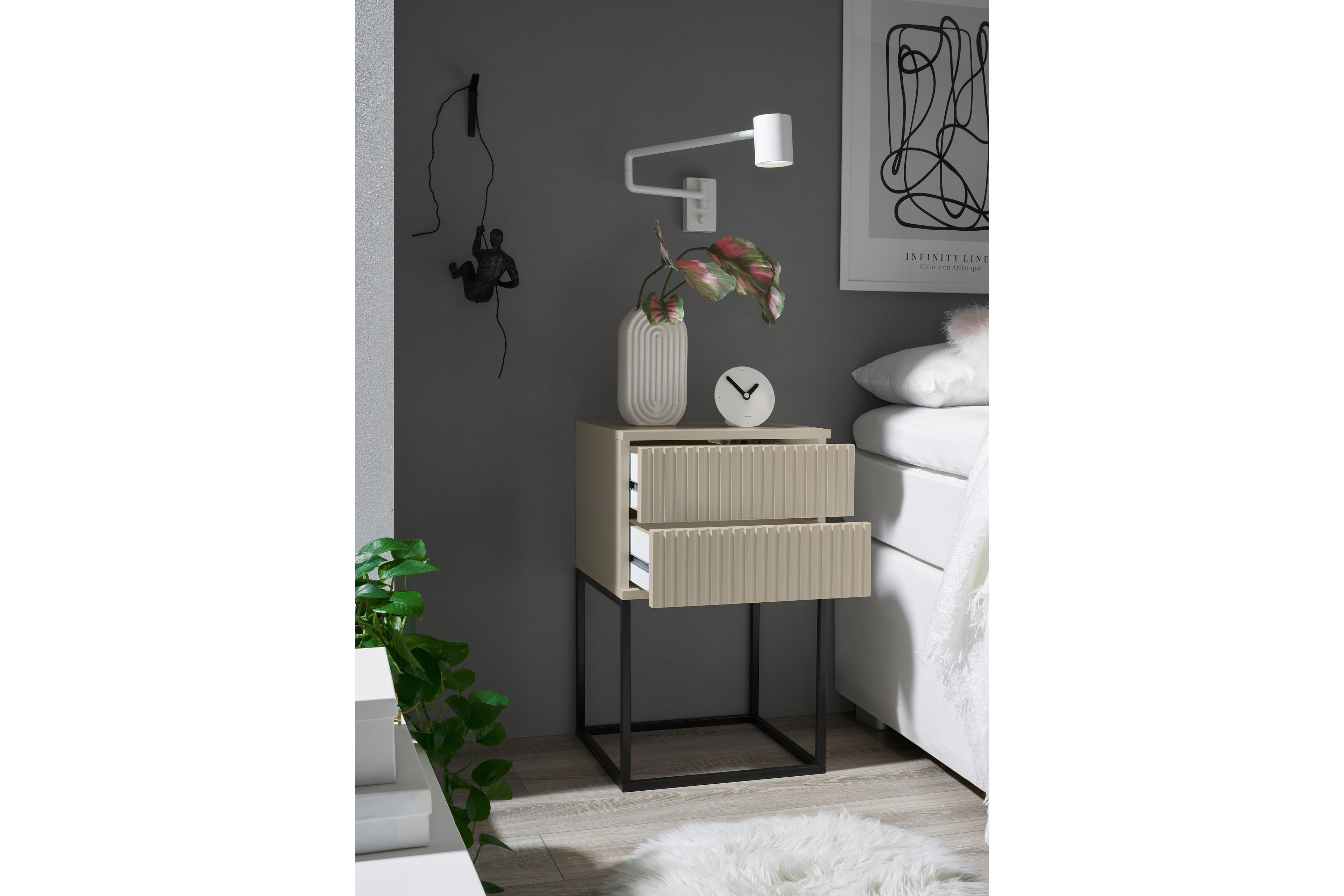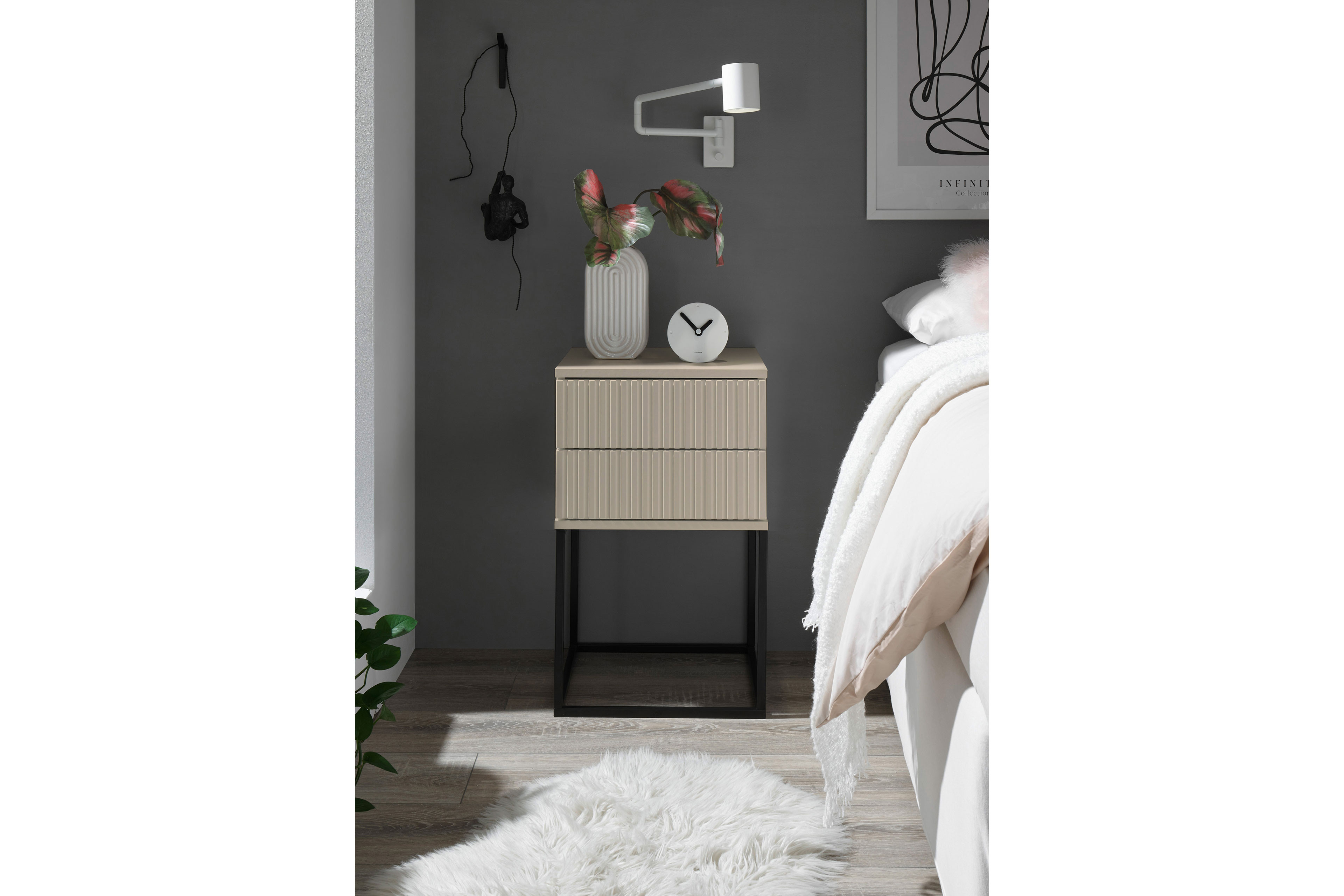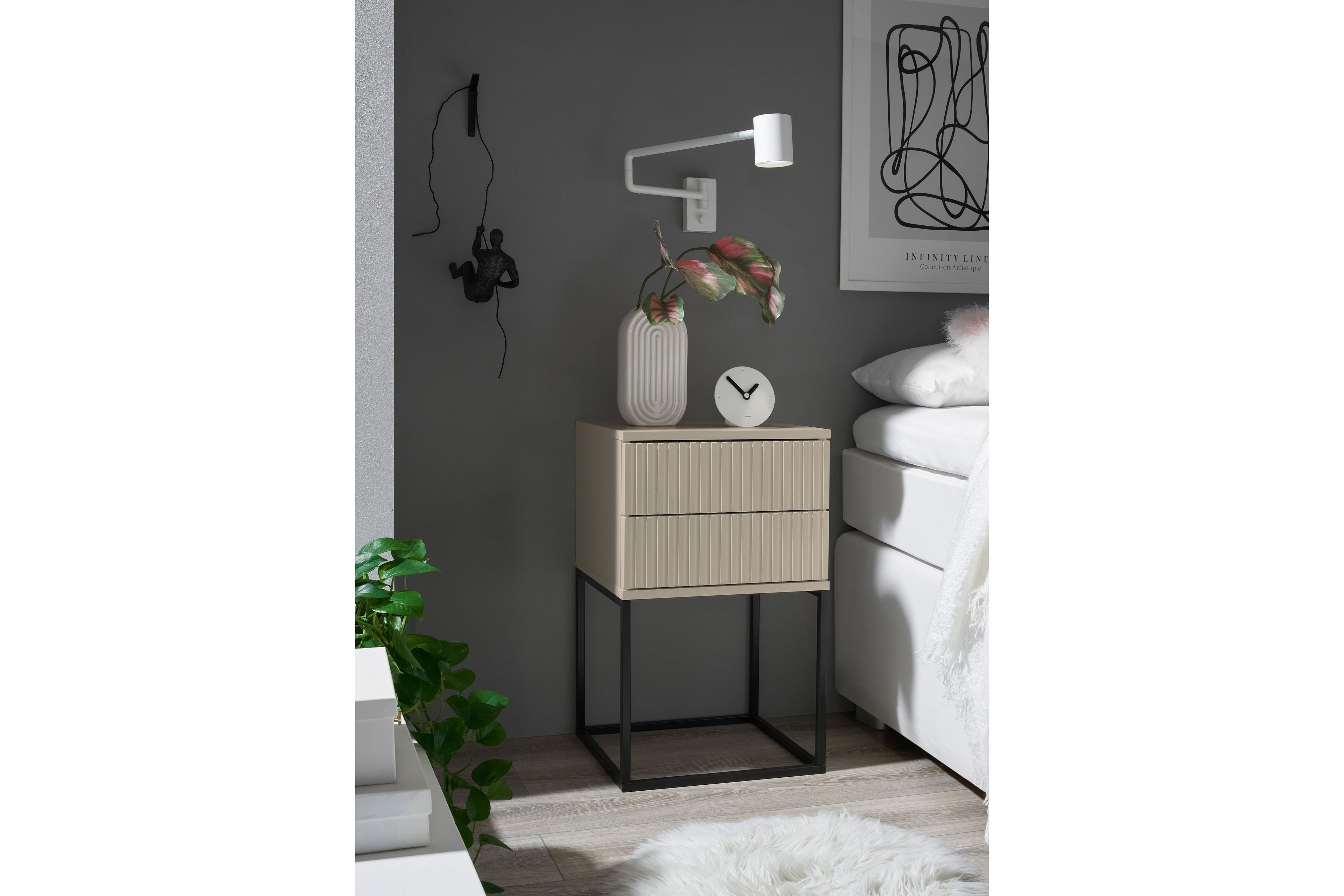 Boxspringbetten haben sich still und heimlich in die Schlafzimmer - und in die Herzen - vieler Menschen geschlichen. Oft ist dabei auch ihre angenehme Einstiegshöhe entscheidend, da sie den Alltag spürbar erleichtert und den Körper schont. Sie haben bereits ein Boxspringbett oder sind im Begriff sich eins zu bestellen und Sie suchen noch die passende Nachtkonsole? Das Nachtkonsolen-Programm Marle von POL Power bietet Ihnen mit dem hier angebotenen Möbelstück die ideale Ergänzung für Ihr hohes Komfortbett. Sie ist ungefähr 40 cm breit und etwa 65 cm hoch, in Etwa so hoch wie die Einstiegshöhe eines Boxspringbettes, und stellt Ihnen gleich zwei Schubladen zum Verstauen zur Verfügung. Das Schubladenpaar, das sich hier in Kaschmir zeigt und sich mit einer grifflosen Front in Rillenstruktur schmückt, wird von einem schwarzen Metallgestell getragen. Die beiden Fächer lassen sich durch einen leichten Druck auf die jeweilige Schubfachfront öffnen. Alle Nachtkommoden aus dem Programm Marle von POL Power in den unterschiedlichen Größen und Ausführungen finden Sie in unserem Konfigurator.