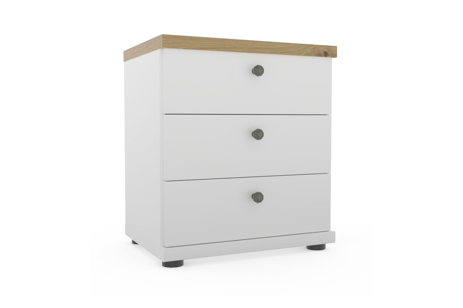 Mit einer Größe von etwa 50 x 57 x 36 cm und drei Schubladen ausgerüstet, überzeugt der kleine Nachtschrank der Schlafzimmerserie Marlow von Wiemann als kompakter und gleichzeitig geräumiger Ordnungshüter neben dem Bett. Er zeigt sich in diesem Angebot in einer freundlichen und naturnahen Kombination aus strahlendem Weiß und einer Bianco-Eiche-Holznachbildung. Als stilvolle Öffnungslösung sind für die Auszüge edle Knopfgriffe vorgesehen, die ein charakteristisches Merkmal des Landhausstils sind, der allen Möbeln des Marlow-Programms als Designkonzept zugrunde liegt. Die vorgestellte Nachtkonsole ist in weiteren Farbausführungen erhältlich. Der Oberboden kann ganz nach Wunsch in einer Holznachbildung oder Ton in Ton mit der gewählten Grundfarbe erscheinen. Im Download-Bereich finden Sie den modellzugehörigen Typenplan, in dem Sie alle Marlow Schlafzimmer-Elemente von Wiemann übersichtlich aufgeführt sehen. Für eine individuelle Bestellung stehen Ihnen gern unsere Einrichtungsexperten via Telefon oder Kontaktformular zur Verfügung.