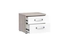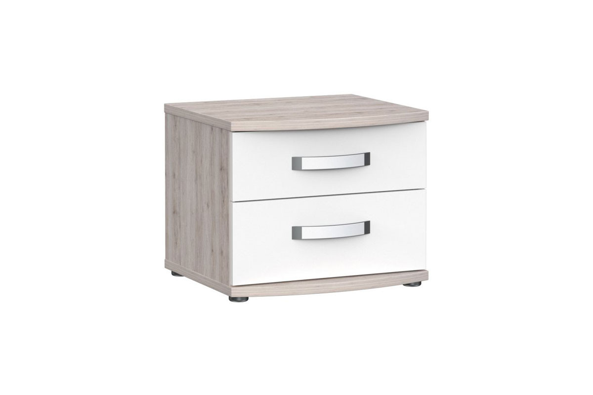 Ausgerüstet mit zwei Schubfächern und auf bodennahen Möbelfüßen stehend, stellt sich hier die kompakte Forte Kommode aus dem modernen Jugend- und Schlafzimmer-Einrichtungsmodell Rondino vor. Die trendige Optik entsteht durch die verwendete Sandeiche, deren graubraune Holznachbildung den Korpus schmückt, und das hochglänzende Weiß, das die Front der Schubladenkommode ziert. Die Kommoden-Front besteht aus zwei gleichgroßen Schubkastenblenden, die jeweils über einen Edelstahl-Griff verfügen. Ob als ideale Nachtkonsole neben einem Jugend- oder Schlafzimmer-Bett, als Beimöbel neben einer Couch oder einfach als dekorative und zweckmäßige Aufbewahrungsmöglichkeit in einem beliebigen Wohnraum - die Rondino Kommode von Forte lässt sich prima mit weiteren Möbelstücken kombinieren. Alle erhältlichen Möbelstücke der Serie finden Sie in unserem Online-Konfigurator - hier ist das Modell Rondino frei planbar.