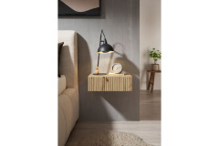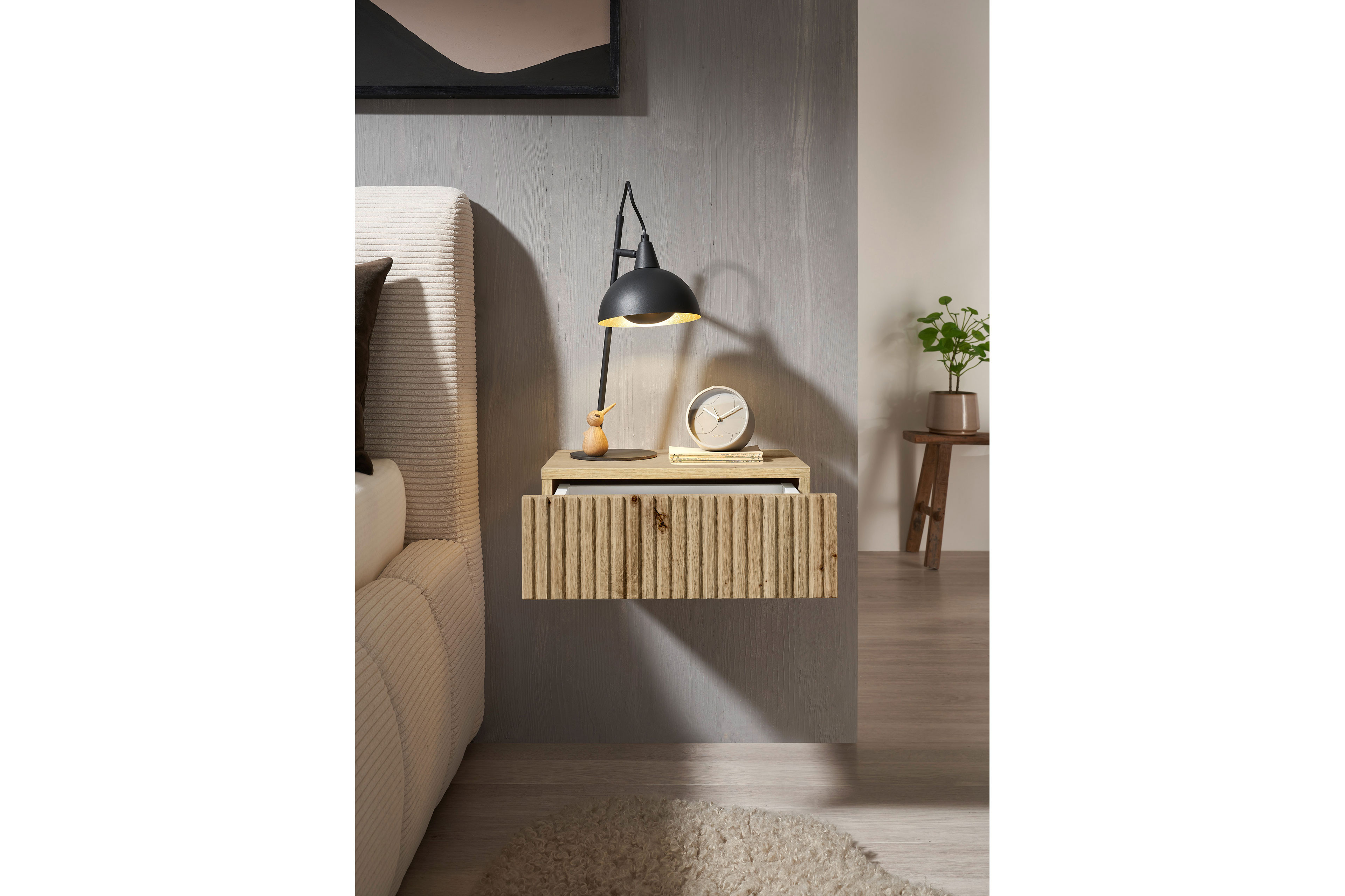 Klein, smart und immer zur Stelle – der Hänge-Nachtschrank Taboni des Möbelherstellers POL Power. Manchmal braucht es nicht viel, um Ordnung und Stil ins eigene Schlafzimmer zu bringen. Diese kleine Hänge-Nachtkonsole ist genau so ein Möbelstück: kompakt, modern und überraschend praktisch. Mit der warm wirkenden Artisan Eiche Nachbildung bringt die Hängekonsole eine natürliche und gemütliche Atmosphäre in Ihr Schlafzimmer Die dekorative Rillenfront schenkt dem hängenden Schubkasten das gewisse Extra und sorgt für einen modernen Look, der sich mühelos mit unterschiedlichen Betten kombinieren lässt. Dank der Push-to-open-Funktion genügt ein leichtes Antippen und schon öffnet sich die Schublade ... ganz ohne Griff. Perfekt für alle, die es schlicht und aufgeräumt mögen. In dem Schubkasten finden beispielsweise Ihr Buch und das Handy-Ladekabel einen festen Platz. Mit den kompakten Maßen ist der Hänge-Nachtschrank ideal für kleinere Räume und auch als schwebende Ergänzung zu modernen Polster- und Boxspringbetten. Und weil diese Konsole direkt an der Wand montiert wird, bleibt der Boden frei. Taboni von POL Power - klein im Format, groß im Komfort.