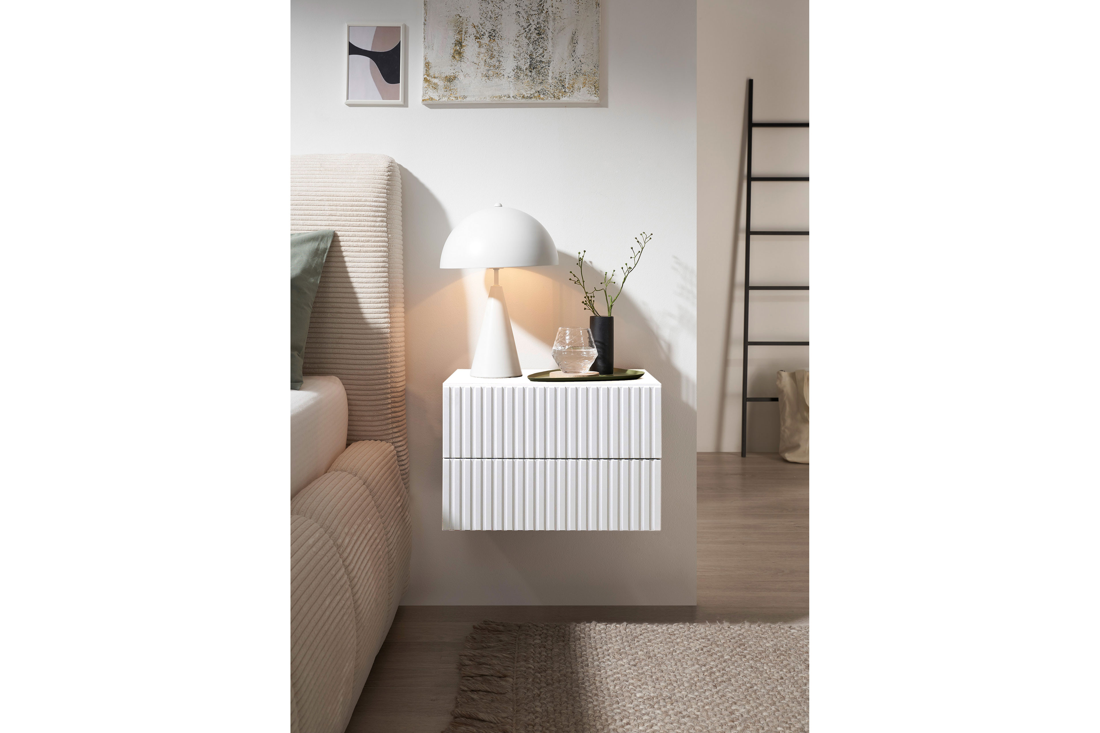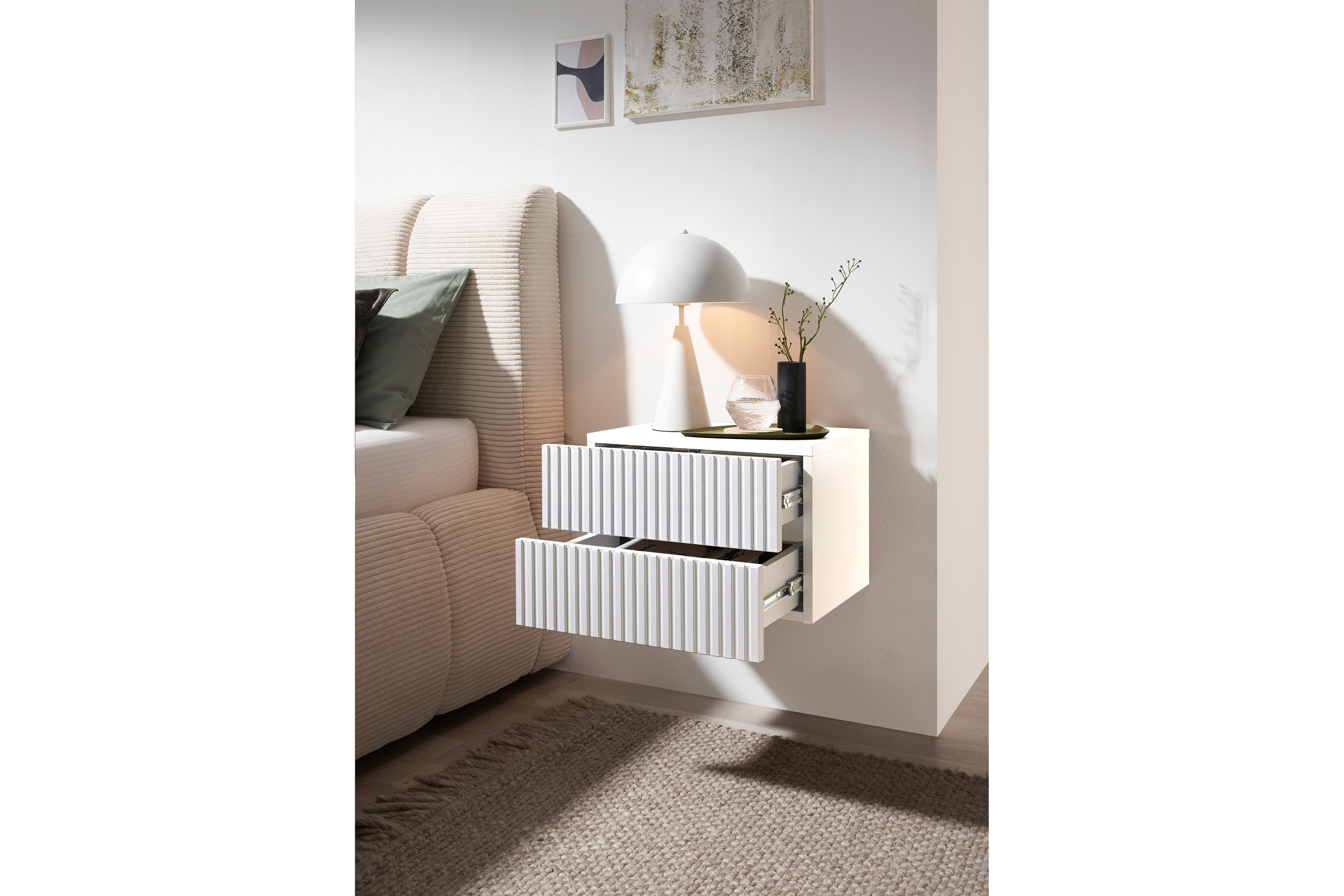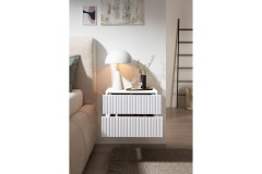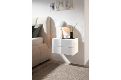 Die kompakte Nachtkonsole Taboni vom Möbelhersteller POL Power ist wie gemacht für alle, die ihr Schlafzimmer ruhig, modern und zugleich gemütlich gestalten möchten – und das zu einem besonders attraktiven Preis. Da sie an der Wand montiert wird und zu schweben scheint, wirkt das Design der Nachtkonsole besonders leicht. Das freundliche Weiß bringt Helligkeit ins Schlafzimmer und lässt sich wunderbar mit Holz, Stoffen oder warmen Farben kombinieren. Da sich Taboni mit einer dekorativen Rillenstruktur-Front schmückt, wirkt sie besonders charmant und interessant. Diese feinen Rillen schenken der Oberfläche Tiefe und Charakter, sodass eine moderne Optik mit wohnlicher Ausstrahlung entsteht. Die beiden praktischen Schubladen bieten Ihnen praktischen Stauraum in direkter Bettnähe und kommen ganz ohne Griffe aus, da sie mit einer Push-to-open-Funktion ausgestattet sind: So genügt ein leichter Druck auf die jeweilige Blende und schon öffnet sich die Lade sanft. Taboni von POL Power - eine durchdachte, moderne Nachtkonsole, die Funktionalität und Ästhetik harmonisch verbindet und Ihrem Schlafzimmer eine frische, zeitgemäße Note verleiht.