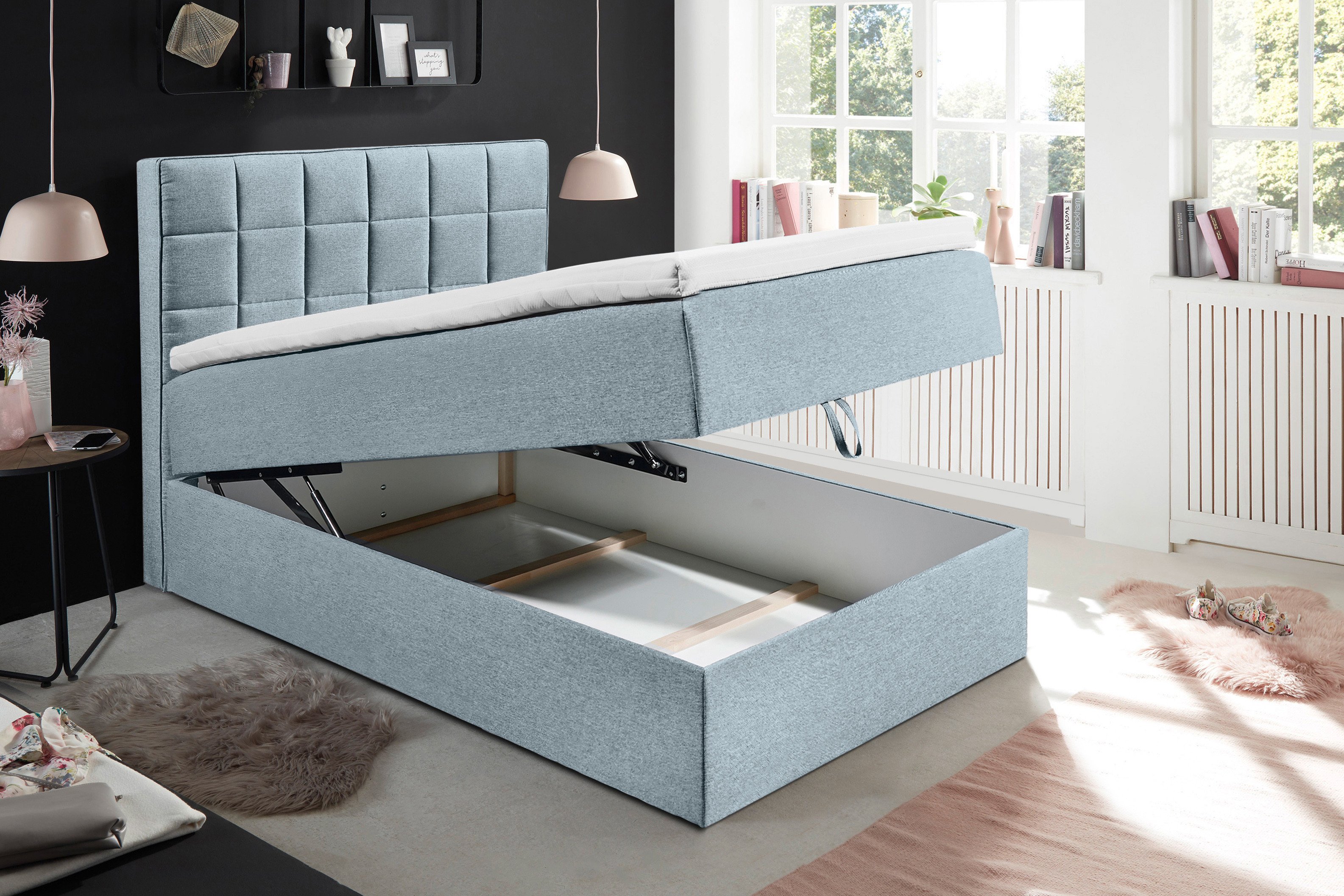 Polsterbett in Boxspringoptik pastellblau von ED-Lifestyle - Modell Alaska-Dream Eine bunte Mischung aus Design, Funktionalität und Komfort.
