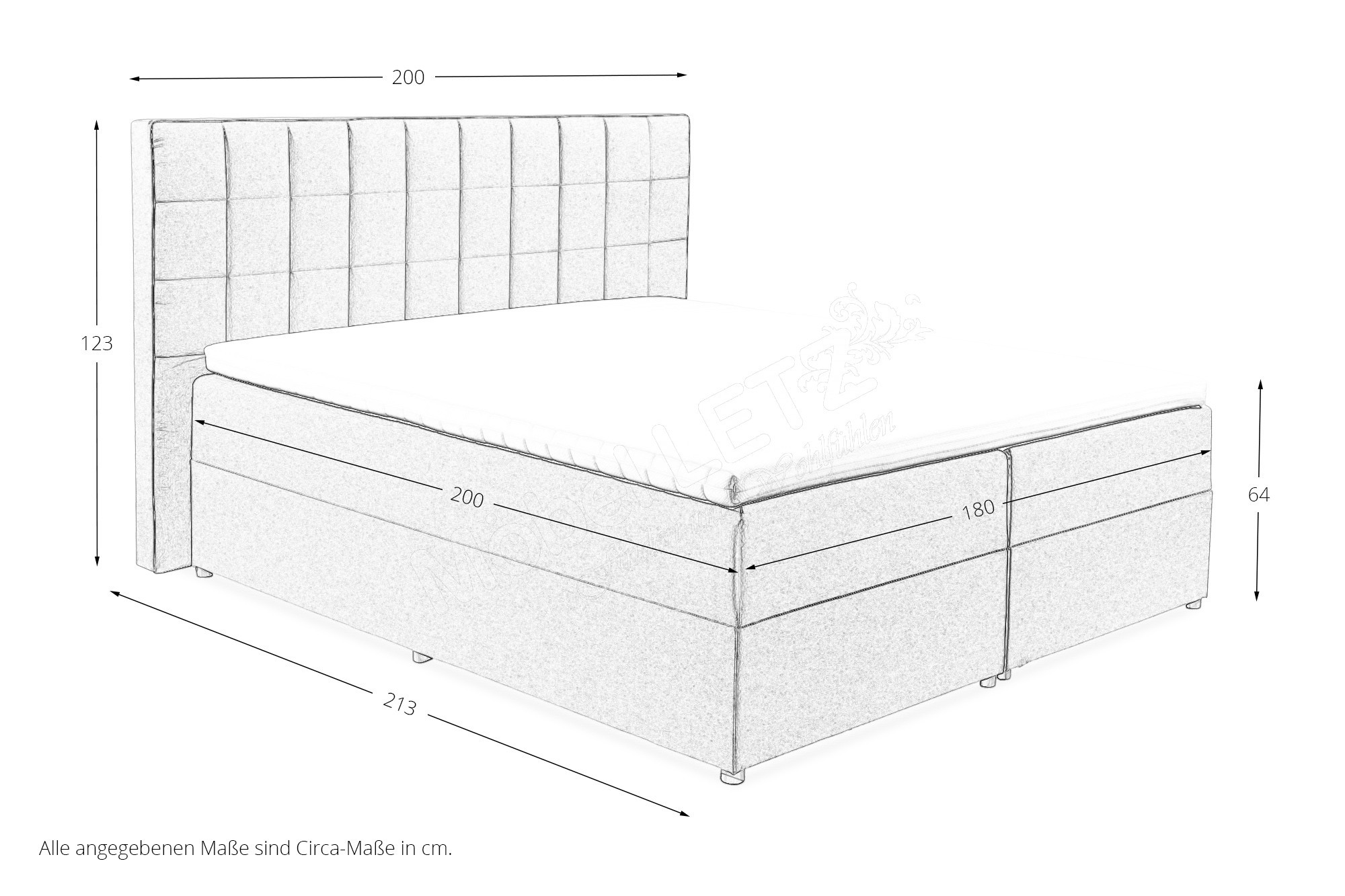 ca. BHT: 200/123/213 cm (mit Überstand am Kopfteil)