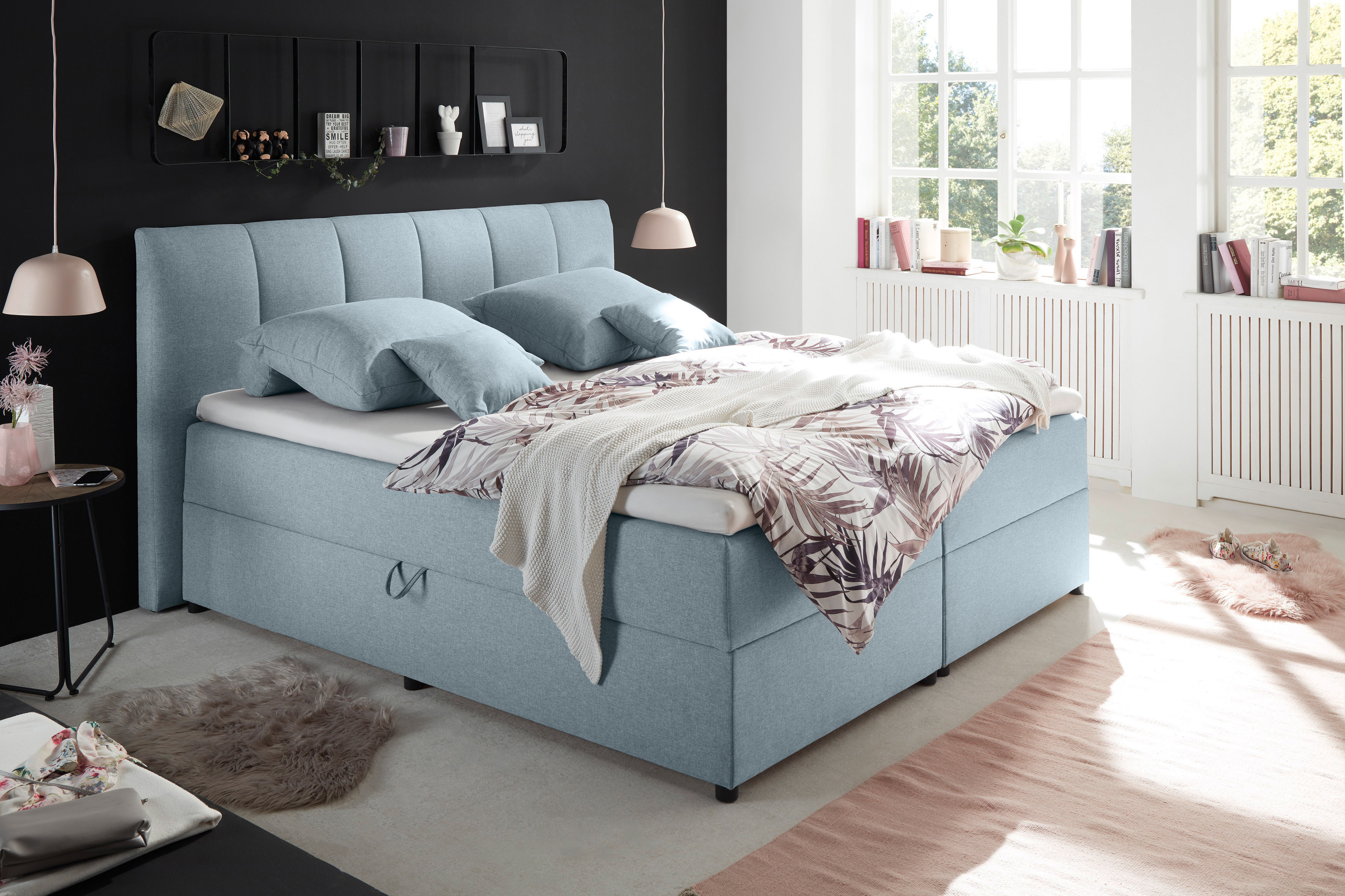 Polsterbett in Boxspringoptik pastellblau von ED-Lifestyle - Modell Granada / Gratiana Eine bunte Mischung aus Design, Funktionalität und Komfort.