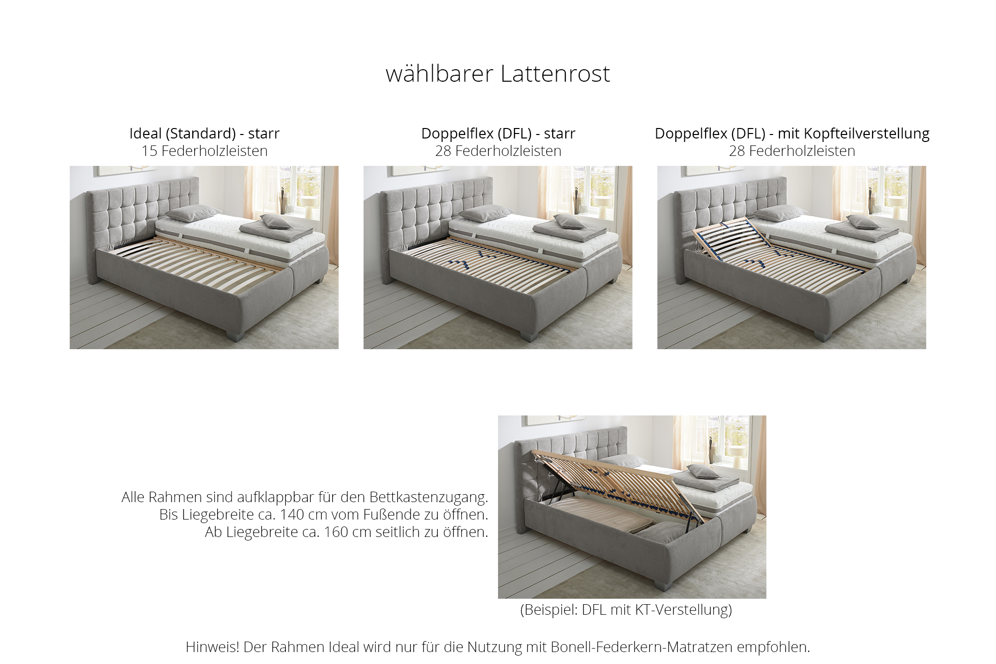 Hinweis! Bettkasten, Lattenrost und optionale Matratze sind ab einer Liegefläche von ca. 160 x 200 cm geteilt. - wählbarer Lattenrost: