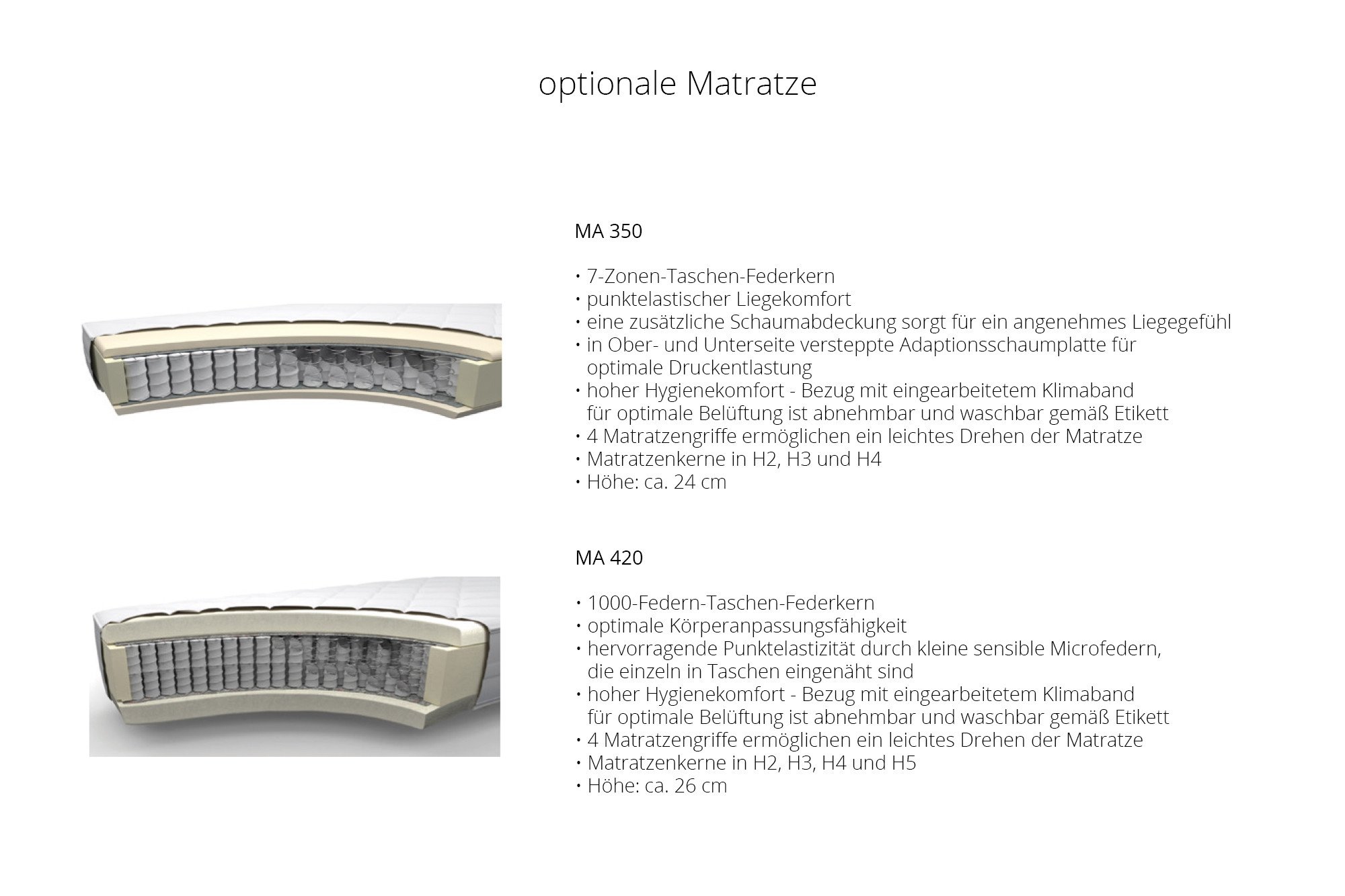 Aufgrund des beidseitigen Bettkastens sind die Matratzenbezüge ab einer Liegefläche von ca. 160 x 200 cm geteilt, auf Anfrage aber auch durchgehend möglich. - optionaler Härtegrad: