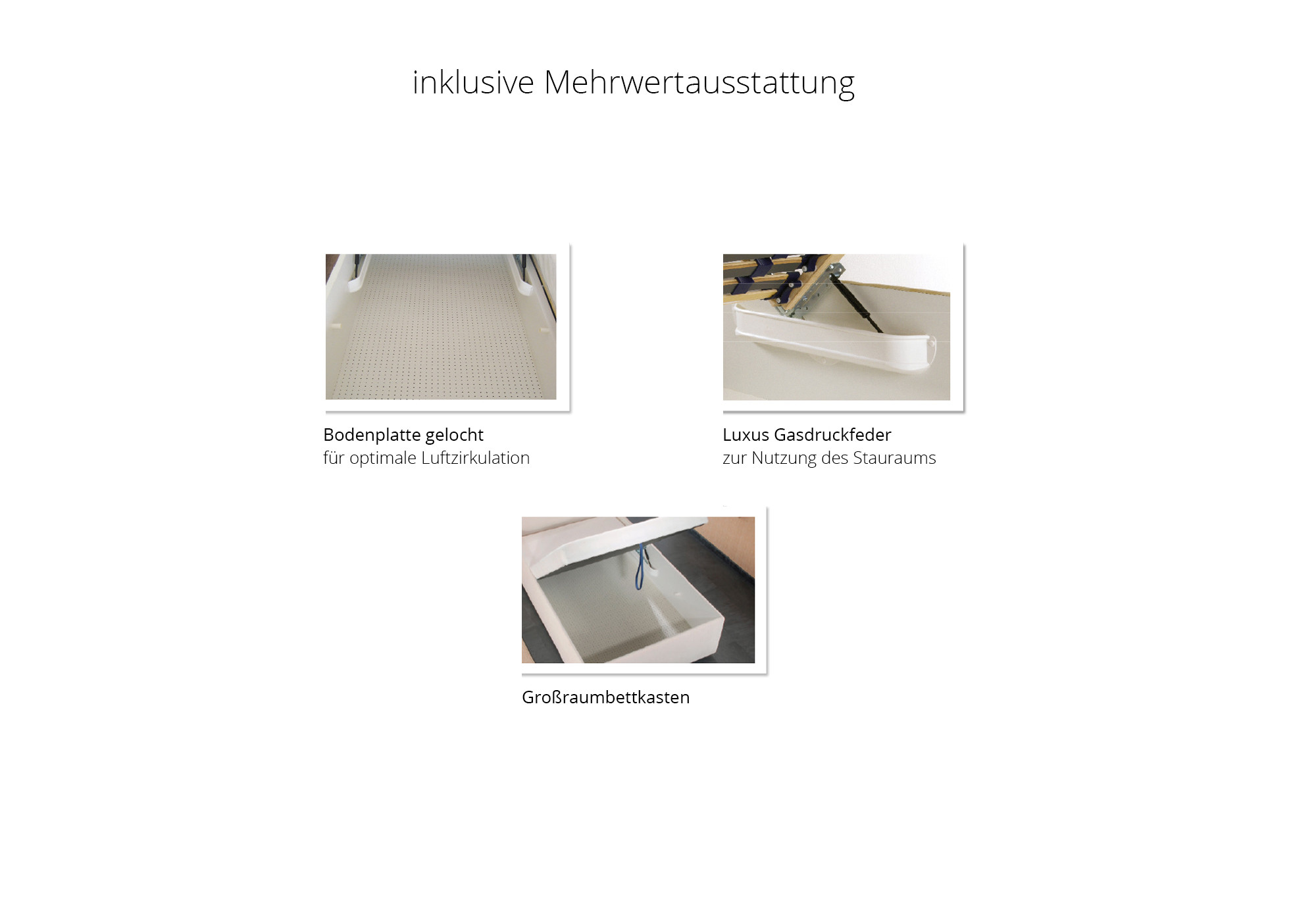 - Funktion: Bettkasten mit Gasdruckfeder und gelochter Bodenplatte