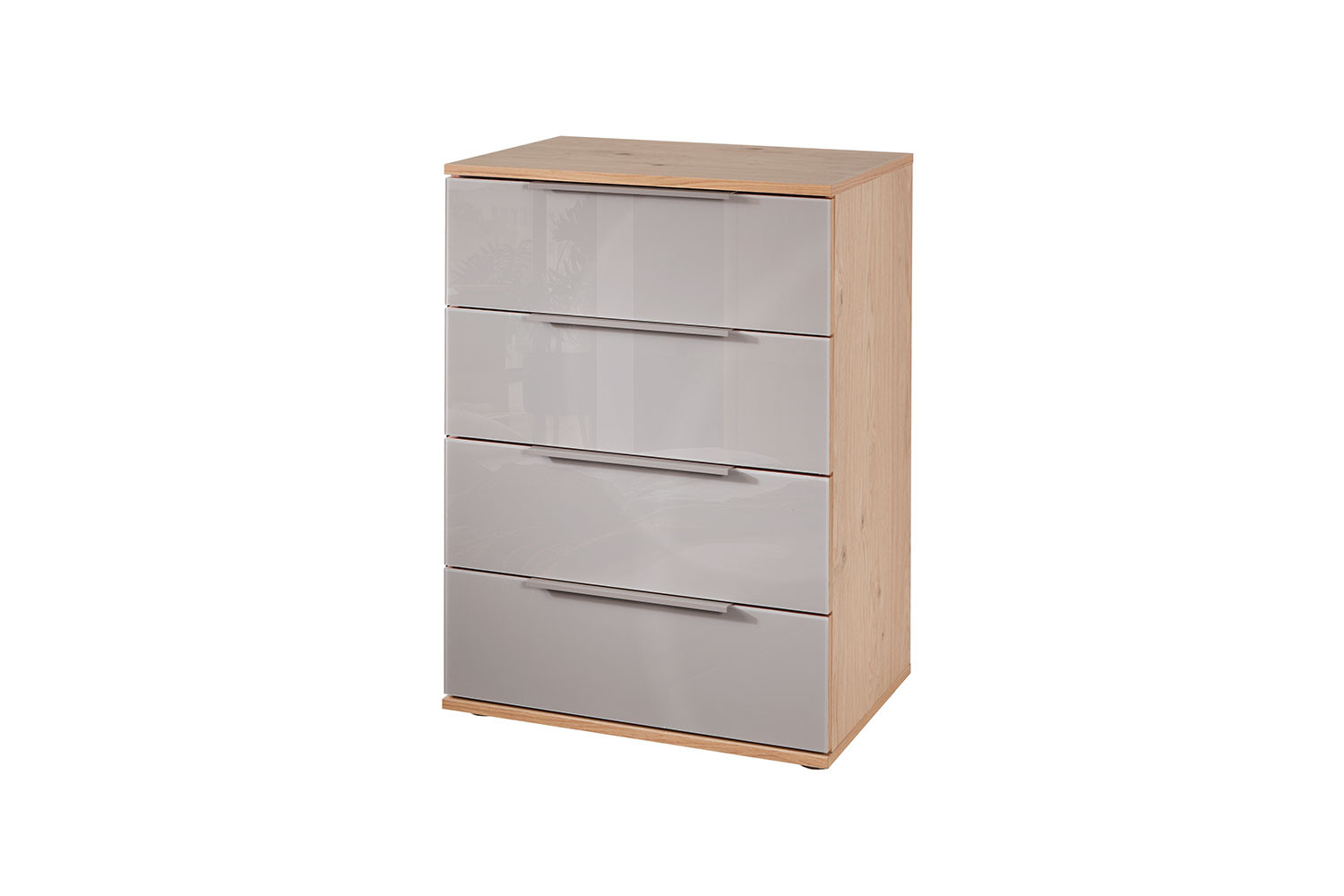 Ideal, wenn auf kleinem Raum zusätzlicher Stauraum gebraucht wird. Die Kommode des Modells Glassystem von Disselkamp vereint spielend leicht Stil und ein minimalistisches Design zu einem feinen Möbelstück. Hier trifft das markante Balkeneiche-Furnier auf seidengraues Glas. Diese beruhigende Kombination lässt sich harmonisch in zahlreiche Wohnstile integrieren und kann in unseren Zusatzoptionen mit wenigen Klicks gegen eine andere Korpus- und Frontausführung ausgetauscht werden. Vier gedämpfte Schubkästen mit Selbsteinzug und Vollauszug bieten ausreichend Platz für Kleidungsstücke, Bürobedarf oder Alltagsgegenstände. Der Oberboden lässt sich durch geeignete Dekoration in eine Präsentationsfläche verwandeln, die Ihre Lieblingsstücke wirkungsvoll in den Mittelpunkt stellt. Glassystem von Disselkamp – das vielseitige Schranksystem für Ihr Schlafzimmer.