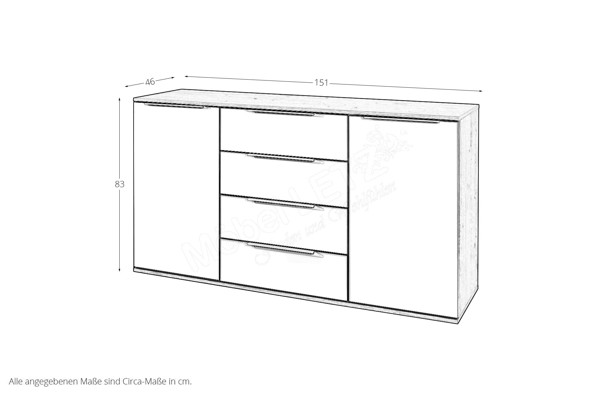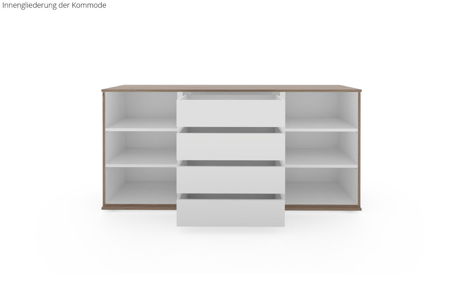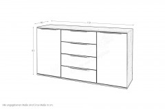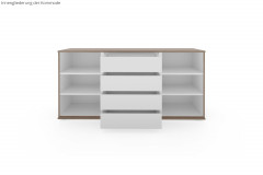 - Kommode: mittig 4 Schubkästen inklusive Vollauszug, links und rechts je 1 Türabteil, hinter den Türen je 2 Böden