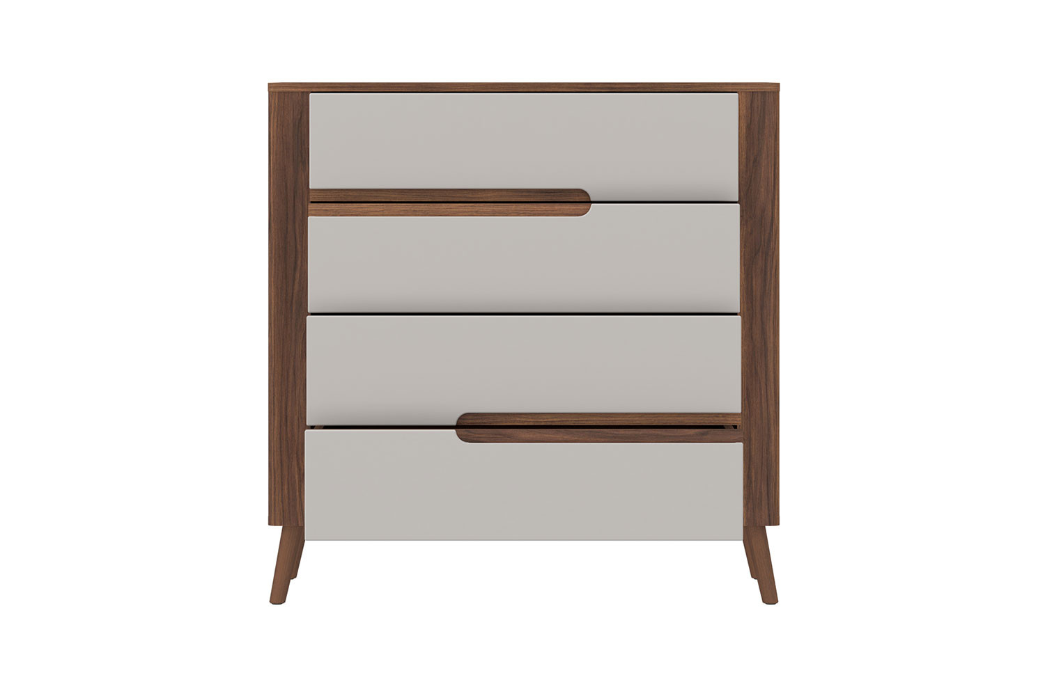 Praktisch, raffiniert und ein absoluter Hingucker im Schlaf-, Arbeits-, Wohn- oder Esszimmer. Die Kommode der Serie Amarillo-sleeping von Meble Wojcik besitzt nicht nur ein ganz besonderes Frontdesign, sondern punktet auch mit ihren inneren Werten. Mit vier Schubkästen, die sich komplett ausziehen lassen, haben Sie genügend Platz für Kleidung, Unterlagen oder kleine Dinge, die Sie immer schnell zur Hand, aber sicher verstaut wissen wollen. Aufgrund ihrer Kugelführung lassen sich diese besonders geräuscharm, stabil und äußerst leichtgängig öffnen und schließen. Eine elegante Walnuss-Nachbildung kleidet den Korpus und setzt auch auf der Front interessante Akzente. Die Front präsentiert sich in einem warmen Neutralton und ist in der zarten Farbe Mondschein gehalten. Vier Holzfüße sorgen für einen sicheren Stand und vollenden die Kommode. Amarillo-sleeping von Meble Wojcik – wenn klassische Eleganz auf moderne Optik trifft.