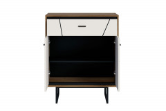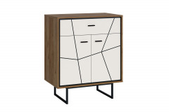 Suchen Sie eine vielseitige und kompakte Kommode? Dann entscheiden Sie sich für unsere Kombi-Kommode aus der Serie Brolo-Schlafzimmer von Meble Wojcik. Mit einem Korpus, den eine Catania-Eiche-Nachbildung schmückt, schwarzen Akzenten und einer folierten Front, die in Hochglanz-Weiß erstrahlt und von einem geometrischen, gefrästen Muster unterbrochen wird, zieht sie alle Blicke im Schlaf-, Wohn- oder Arbeitszimmer auf sich. Besonders elegant und praktisch zugleich sind die beiden schwarzen Metallkufen, die das Möbelstück tragen. Sie sorgen dafür, dass sich die Bodenfläche unter dem Highboard problemlos reinigen lässt und so auch für Saugroboter zugänglich ist. Gegliedert in ein Türenabteil mit Softclose, das einen Fachboden enthält, sowie in eine Schublade mit Vollauszug, bietet sie viel Platz und Stauraum für Gegenstände, die Sie gerne griffbereit haben möchten. Vervollständigen Sie Ihren Wohnraum und verleihen Sie ihm mit den Schlafzimmermöbeln der Kollektion Brolo-Schlafzimmer von Meble Wojcik eine moderne Note.