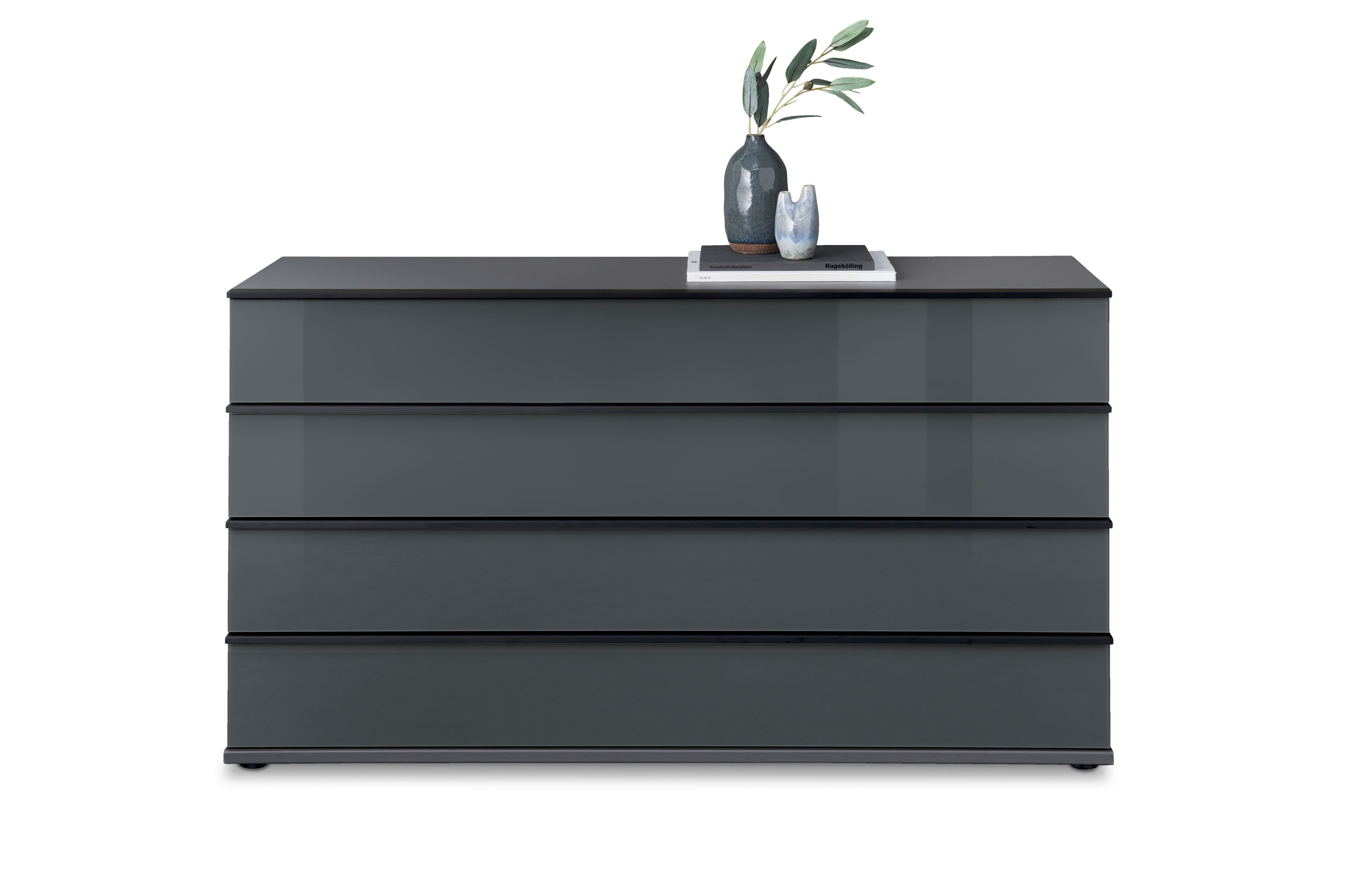 Mit vier mittig geteilten Großraum-Schubkästen wartet die Musterring Kommode aus dem Schlafzimmer-Programm San Antonio auf. Aufgrund seiner Größe von etwa 149 x 82 x 42 cm bietet sich dieses Möbelstück auch als Sideboard im Wohnbereich an. Optisch haben Sie die Wahl zwischen einem eleganten Lava- und einem sanften Champagner-Farbton, wobei der Korpus stets als Dekor und die Front als Glas erscheint. Alle Schubladen sind serienmäßig mit einem praktischen Selbsteinzug und einer komfortablen Dämpfung ausgerüstet, sodass sich die Auszüge nach der Nutzung sanft und leise schließen lassen. Wenn Sie sich einen Überblick über das San Antonio Sortiment oder über weitere Musterring Möbel für die unterschiedlichsten Wohnbereiche verschaffen möchten, können Sie sich unter dem Punkt Downloads den Typenplan und das aktuelle Musterring Magazin ansehen. Ihre persönlichen Wunschelemente sind auch problemlos über unsere Einrichtungsexperten per Telefon oder Kontaktformular bestellbar.