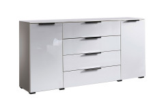 Ein Sideboard mit vier breiten Schubladen und zwei Türabteilen mit je drei Fächern bietet unterschiedliche Aufbewahrungsoptionen und erlaubt so individuelle Einsatzmöglichkeiten. Ganz in Weiß, mit einer edlen Glasfront und chromfarbenen Möbelgriffen passt sich die hier vorgestellte Kombikommode aus dem Programm SCALE-Box von Rauch Black zudem ganz leicht an verschiedene Einrichtungsstile an und wird so zu einem universell nutzbaren Möbelstück. Problemlos können Sie das Aussehen verändern und bestmöglich an Ihre Wünsche anpassen. Nutzen Sie dazu die Zusatzoptionen, die Ihnen alternative Vorschläge für den Kommoden-Korpus, die Front sowie die Griffe unterbreiten. Dadurch ist das Rauch Sideboard mit einer Größe von etwa 160 x 80 x 42 cm je nach gewählten Attributen mit einem Look von klassisch schlicht über natürlich schön bis hin zu zeitlos elegant realisierbar. Dank gedämpfter Türscharniere sowie praktischen Vollauszügen und sanften Selbsteinzügen der Schubladen bietet die Kombikommode zusätzlich einen außergewöhnlich angenehmen Bedienkomfort.