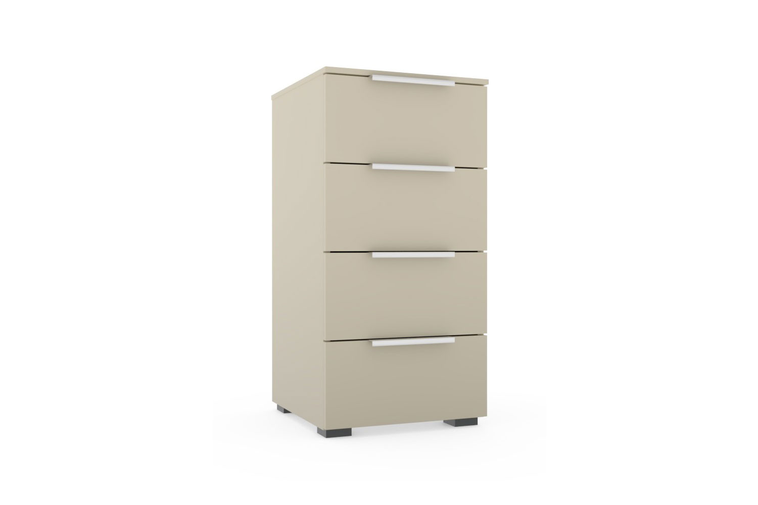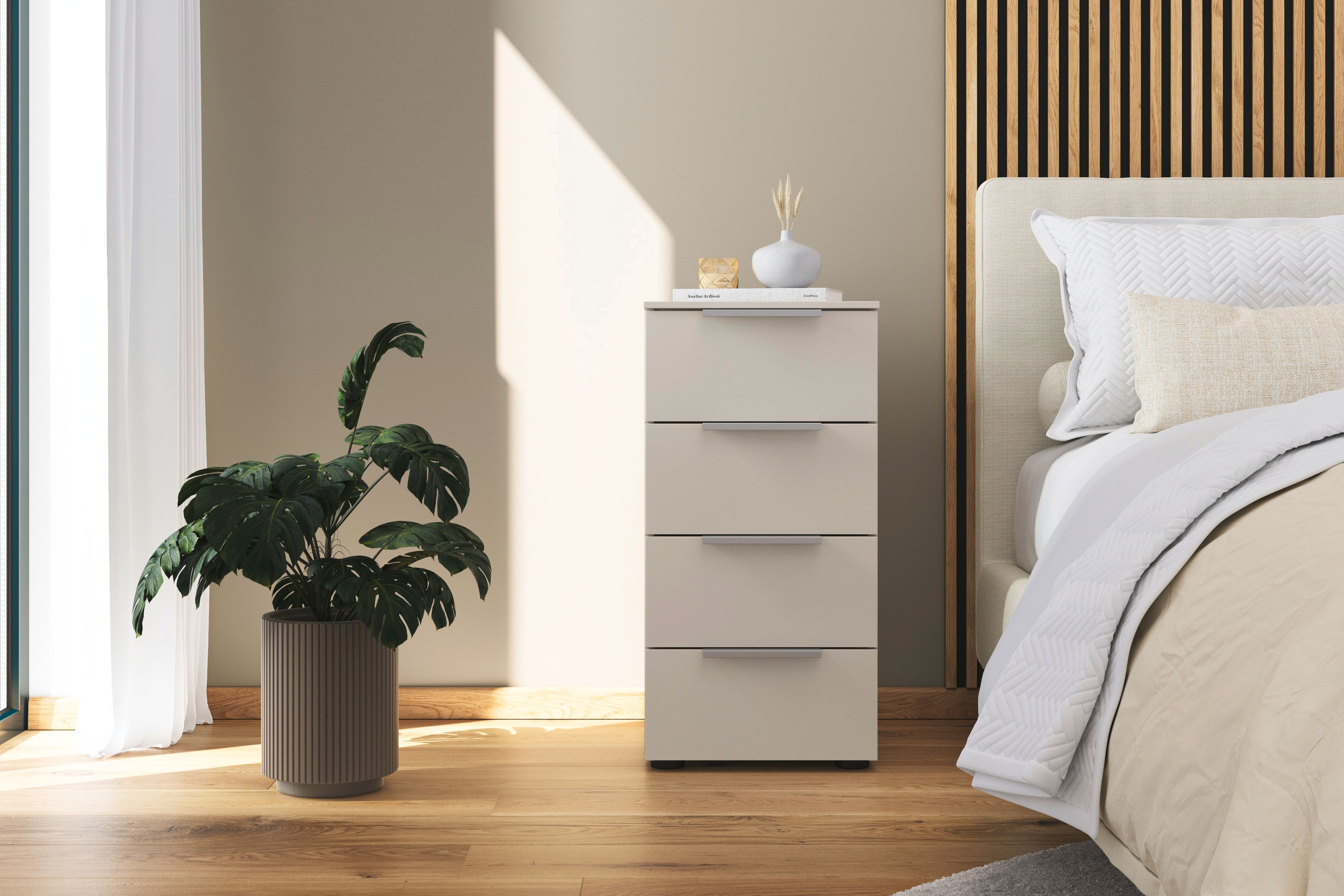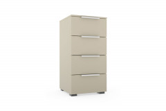 Die nur etwa 40 cm breite, ca. 80 cm hohe und rund 42 cm tiefe, champagnerfarbene Kommode des Modells SCALE-Box von Rauch Black wartet mit vier Schubladen inklusive Vollauszug und gedämpftem Selbsteinzug auf. Dank der kompakten Größe lässt sich das Möbelstück beispielsweise auch in einer schmalen Nische unterbringen, damit der dort vorhandene Platz nicht ungenutzt bleibt. Die leichtgängigen Auszüge überzeugen mit ihren komfortablen Eigenschaften und erlauben ganz einfach den Blick auf den gesamten Inhalt der Lade, da man diese komplett ausziehen kann. Der Schließvorgang gestaltet sich zudem besonders sanft und leise. Schauen Sie in die Zusatzoptionen, wenn Sie die Rauch Kommode farblich oder in der Breite verändern möchten. Dort stehen Ihnen verschiedene Attribute zur Wahl, um das praktische Möbelstück bestmöglich an Ihre Wünsche und den Ort der Nutzung anzupassen. Sie suchen noch weitere Schlafzimmermöbel der Reihe SCALE? Klassische Drehtürenschränke finden Sie im Programm SCALE-Spin, platzsparend öffnende Schwebetürenschränke stellen wir Ihnen im Modell SCALE-Slide vor, die zugehörigen Betten sind unter SCALE-Sleep zusammengefasst und Beimöbel, wie die abgebildete Schubfachkommode, können Sie in der Serie SCALE-Box entdecken.