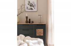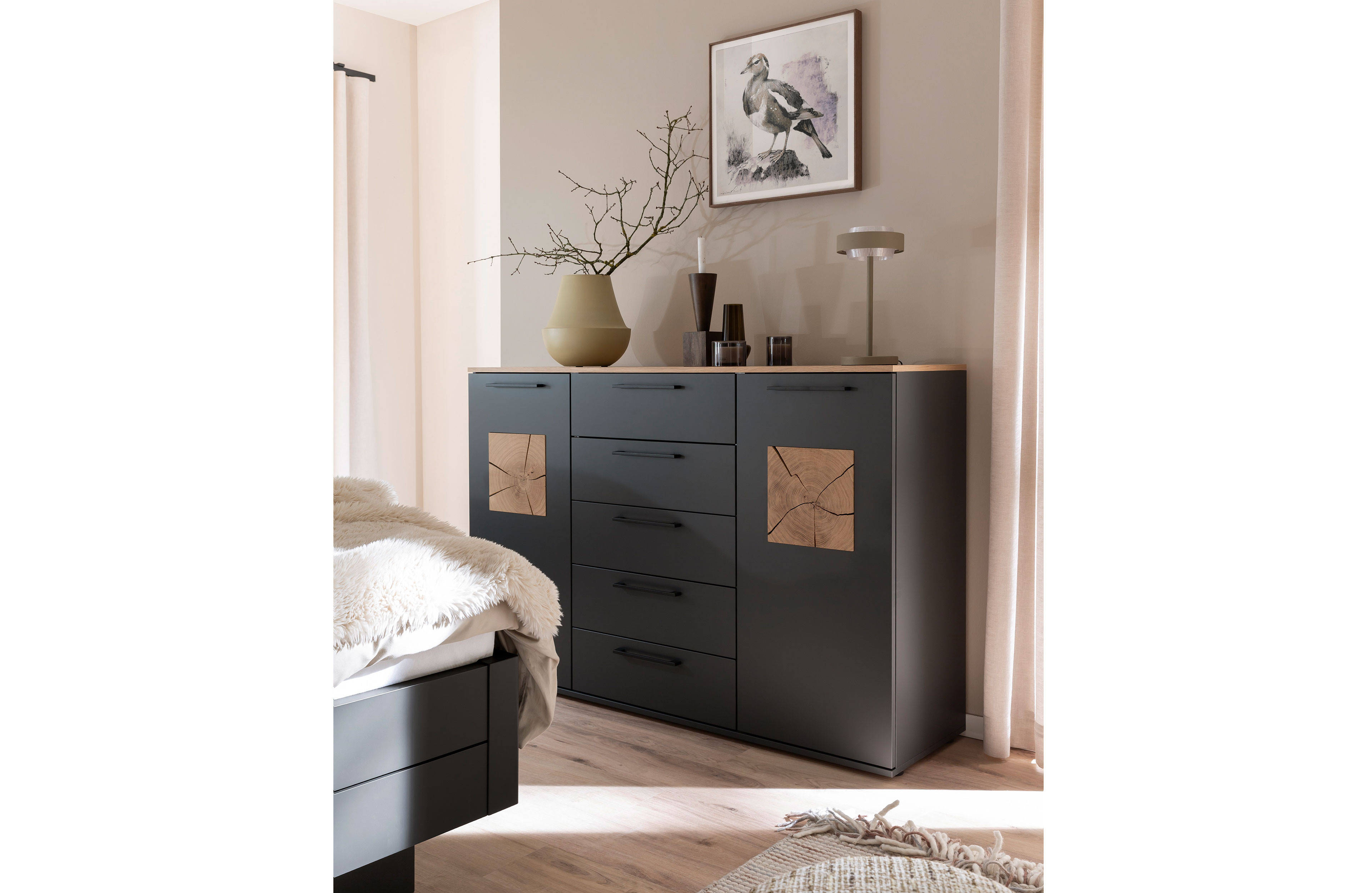 Das Sideboard der Serie Multiline von SCHÖNER WOHNEN vereint zwei Welten in vollkommener Balance: mit einem Korpus in kühlem Lack Basalt und einem Oberboden in warmem Wildeichen-Furnier. Es verbindet hochwertige Materialien mit einem zeitlosen Designanspruch, der jeden Wohnraum bereichert. Als besonderes gestalterisches Highlight zieren zwei Einsätze aus massivem Wildeiche-Hirnholz die Türfronten. Die sichtbaren Jahresringe der Intarsien machen jedes Möbelstück zu einem Unikat. Hinter den beiden Türen mit Softabstoppung befinden sich je zwei Fachböden für vielseitige Aufbewahrungsmöglichkeiten. Die fünf voll ausziehbaren Schubladen sind mit einer praktischen Dämpfung versehen und schließen so besonders komfortabel. Auch als Stellfläche für Dekorationsobjekte eignet sich das Möbelstück bestens und präsentiert so Ihre Lieblingsstücke. Sie möchten die Ausführungen ganz individuell anpassen? Dann wählen Sie eine der eleganten Varianten in unseren Zusatzoptionen und erstellen Sie sich so ganz einfach Ihre ganz eigene Version der Superkombi-Kommode Multiline von SCHÖNER WOHNEN.