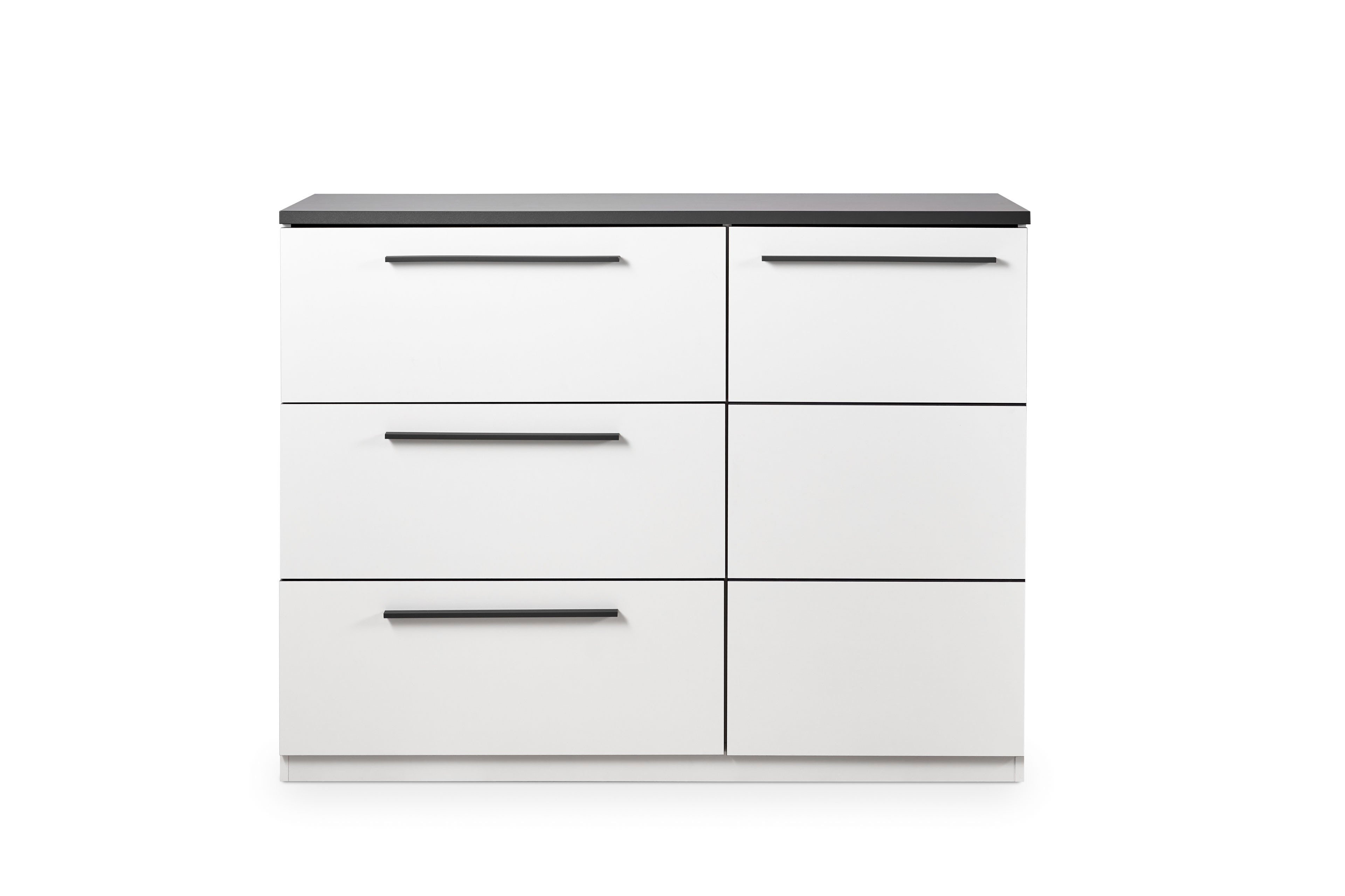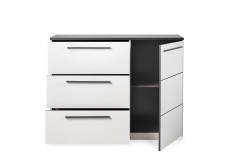 Komfort und Design gehen bei dieser Kombikommode des Programms Denver-sleeping von SchlafKONTOR trendline Hand-in-Hand. Hier dominieren weiße Oberflächen das Erscheinungsbild, während graphitfarbene Absetzungen für eine kontrastreiche Abwechslung sorgen. Auf einer Gesamtbreite von etwa 125 cm bietet Ihnen die Kommode ein Tür-Element, das im Inneren von einem Boden in zwei Fächer gegliedert ist, und drei geräumige Schubladen zum Verstauen an. Dabei sind alle Beschläge aus Metall und deshalb extrem stabil und hoch belastbar. Die Topfbänder der Türen haben eine Softabstoppung und schließen ebenso wie die Schubkästen, die auf Unterboden-Metallführungen laufen und mit Selbsteinzug und Softabstoppung ausgerüstet sind, angenehm flüsterleise. Das Programm Denver-sleeping enthält neben dieser schicken Kombikommode auch einen Kleiderschranl und Nachtkonsolen - alle Möbelstücke der Einrichtungsserie finden Sie in unserem Konfigurator. Natürlich können Sie die moderne Schlafzimmer-Kommode Denver-sleeping von SchlafKONTOR trendline auch in andere Wohnbereiche integrieren, da sie beispielsweise auch im Wohn- und Speisezimmer oder im Flurbereich eine gute Figur macht.
