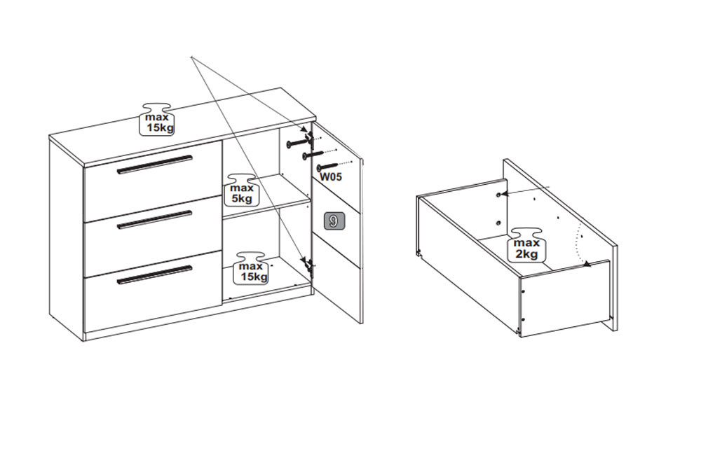 - Oberboden maximal belastbar bis 15 kg, Unterboden maximal belastbar bis 15 kg, Einlegeboden maximal belastbar bis 5 kg, Schubkästen je maximal belastbar bis 2 kg
