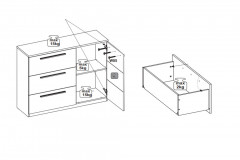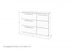 - Kommode: 3 Schubkästen links, 1 Tür rechts (dahinter 1 Boden)