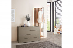 Mit der Kombination aus Kommode und Anstellgarderobe präsentiert der Hersteller Thielemeyer ein harmonisch durchdachtes Möbel-Set aus dem Schlafraumprogramm Plan - hier wird ästhetische Klarheit mit funktionaler Raffinesse vereint. Die Schubladenkommode hat vier Fächer und schmückt sich mit einem graubraunen Lack im Farbton Fango. Die grifflose Front unterstreicht die moderne Gestaltung und lässt sich dank des integrierten Push-to-open-Mechanismus leicht und komfortabel öffnen, was dem Design eine ruhig Wirkung verleiht. Die Anstellgarderobe ergänzt das Möbelstück um eine vertikale Komponente, die in ihrer Rückwand den fango-farbenen Lack mit natürlichen Wildeiche-Lamellen kombiniert – ein spannendes Zusammenspiel aus Eleganz und warmer Holzstruktur, das dem Set Tiefe und Ausdruck verleiht. Für noch mehr Komfort im Alltag lassen sich die Schubkästen optional mit Vollauszügen ausstatten, während sich das optische Gesamtbild durch eine alternative Lackierung in sanftem Champagner aufhellen lässt. Wer den Look noch individueller gestalten möchte, kann die Rückwand der Garderobe statt mit Lamellen auch mit Wiener Geflecht oder Spaltholz auswählen, wodurch wahlweise eine luftige Leichtigkeit oder eine besonders charakterstarke Note entsteht. Eine optionale Beleuchtung für das Paneel setzt gezielte Lichtakzente, hebt die Materialkontraste hervor und sorgt für eine atmosphärische Stimmung im Raum. Die Kommode mit Anstellgarderobe aus dem Programm Plan von Thielemeyer steht für ein durchdachtes Wohnkonzept, das sich mühelos in moderne Räume einfügt und dabei Individualität, Qualität und Handwerkskunst auf höchstem Niveau vereint.
