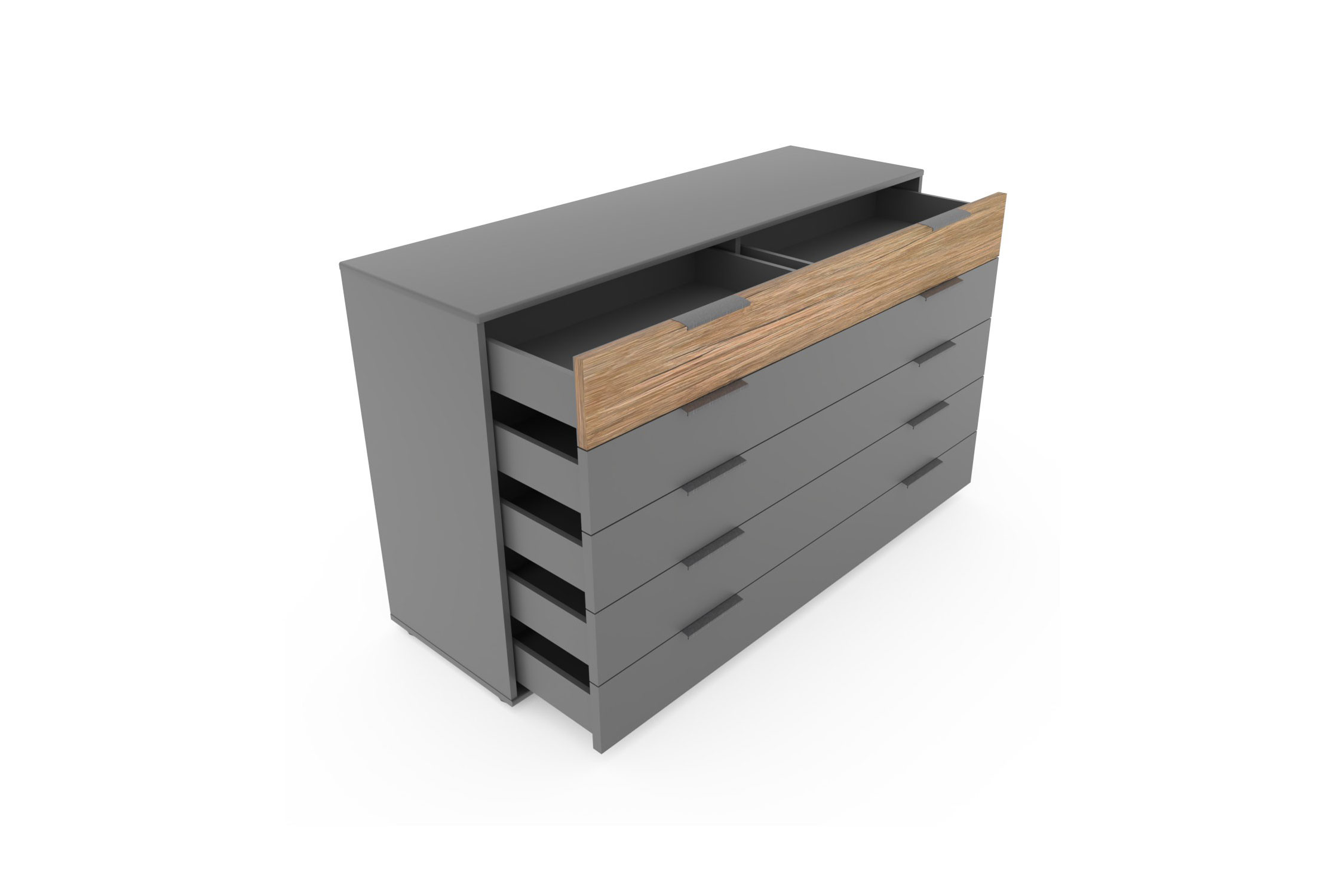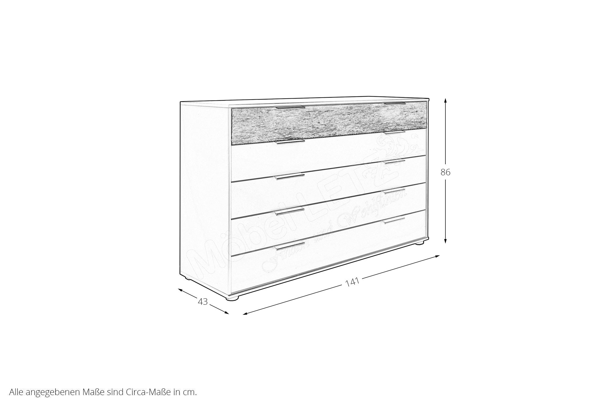- Kommode: mit 5 Auszügen, jeweils mittig geteilt