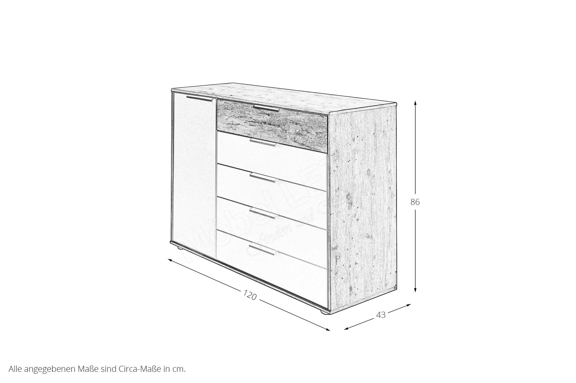 - Kommode: 1-türig, mit Anschlag links, 5 Schubkästen rechts, oberer Auszug in Absetzung