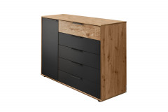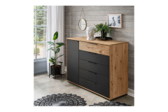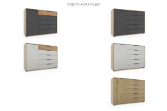 Ein schmales Tür-Abteil mit einem integrierten Fachboden und insgesamt fünf Schubladen bilden das gut durchdachte Ordnungssystem der rund 120 x 86 x 43 cm großen Wiemann Kombikommode aus dem Programm Cadiz. Äußerlich zeigt sich das Möbelstück in einer Mischung aus einer Bianco-Eiche-Nachbildung, einem klassischen Graphit-Dekor und natürlichem Riffholz, das als fühlbarer Akzent die oberste Schubkastenfront ziert. Die dunklen Griffe erscheinen hier eher dezent und unterstreichen so ganz zurückhaltend das lineare, zeitgemäße Designkonzept. Mithilfe der Zusatzoptionen können Sie die Optik des Sideboards aus der Wiemann Schlafzimmer-Kollektion auch verändern und so bestmöglich an Ihre Wünsche anpassen. Wenn Sie auf der Suche nach weiteren Cadiz Schlafraummöbeln sind, empfehlen wir Ihnen einen Blick in den modelleigenen Typenplan, der Ihnen unter dem Punkt Downloads bereitgestellt wurde. Eine individuelle Bestellung kann dann ganz einfach telefonisch, per Kontaktformular oder über unseren Live-Chat veranlasst werden. Unsere kompetenten Einrichtungsexperten planen auch gern bei Bedarf ein komplettes Schlafzimmer nach Ihren Wünschen.