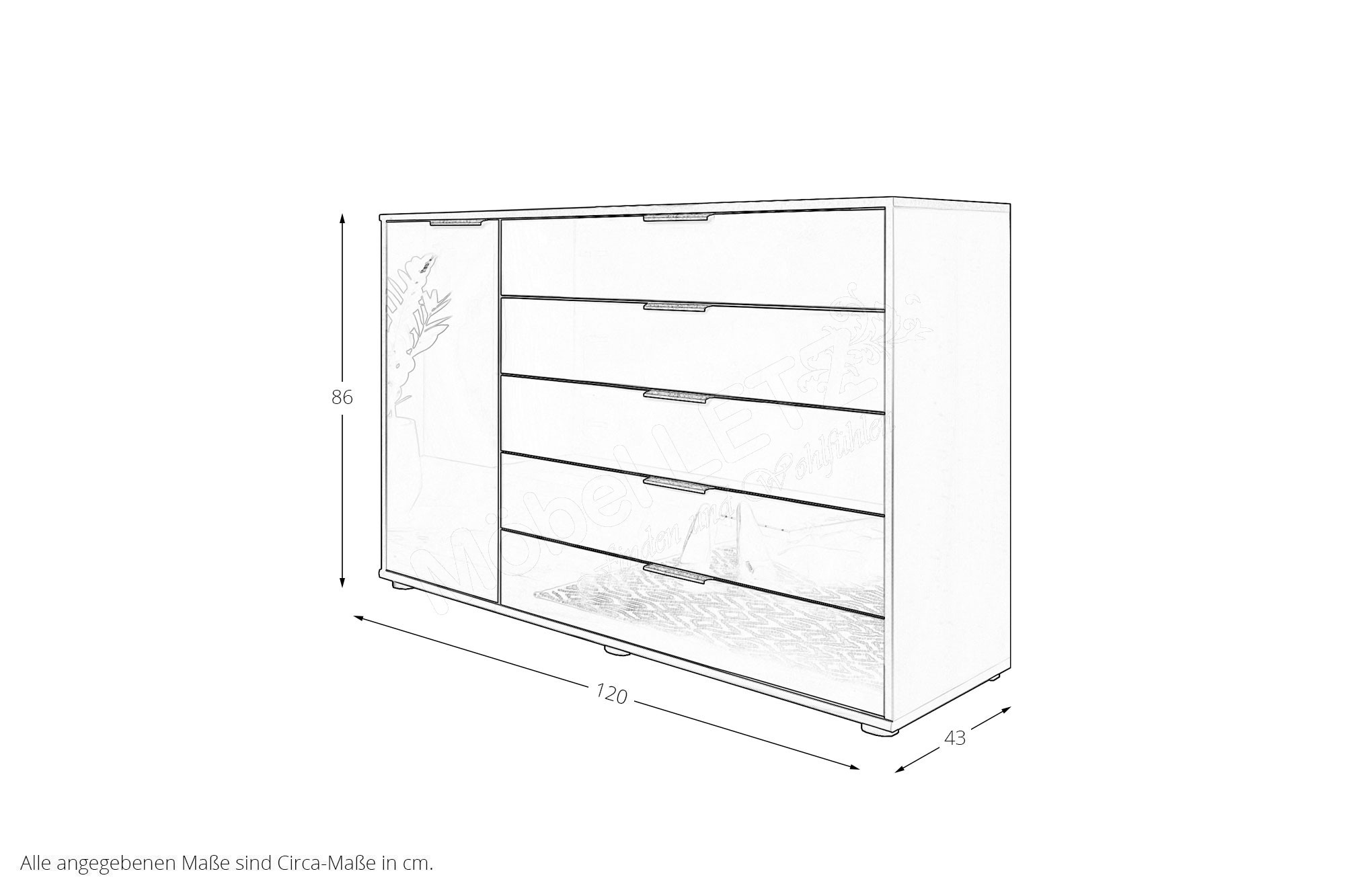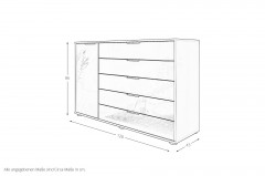 - Kommode: rechts 5 Schubladen, links 1 Tür (Anschlag links), dahinter 1 Einlegeboden