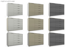 Mit einer klaren Unterteilung präsentiert sich die hier angebotene Wiemann Kommode aus dem Schlafzimmer-Modell Parma. Sowohl die Front der Tür, die sich linksseitig befindet, als auch die Schubladenfronten schmücken sich mit champagnerfarbenen Glasauflagen, während sich der Kommoden-Korpus und die Abdeckplatte in sanftem Champagner-Dekor zeigen. Fünf breite Schubkästen und ein Türelement, das sich dank der integrierten Dämpfung sanft und leise schließen lässt, bieten jede Menge Stauraum, um verschiedene Textilien, Dekorationen oder auch modische Accessoires jederzeit griffbereit und ordentlich sortiert unterzubringen. Über den Punkt Zusatzoptionen können Sie das etwa 120 x 86 x 43 cm große Sideboard bei Bedarf optisch verändern. Im zugehörigen Typenplan finden Sie noch eine große Anzahl weiterer Wiemann Schlafzimmer-Möbel der Serie Parma. Falls Ihr Wunsch-Element nicht direkt online bestellt werden kann, können Sie sich gern via Kontaktformular oder per Telefon an unsere Einrichtungsexperten wenden.