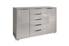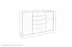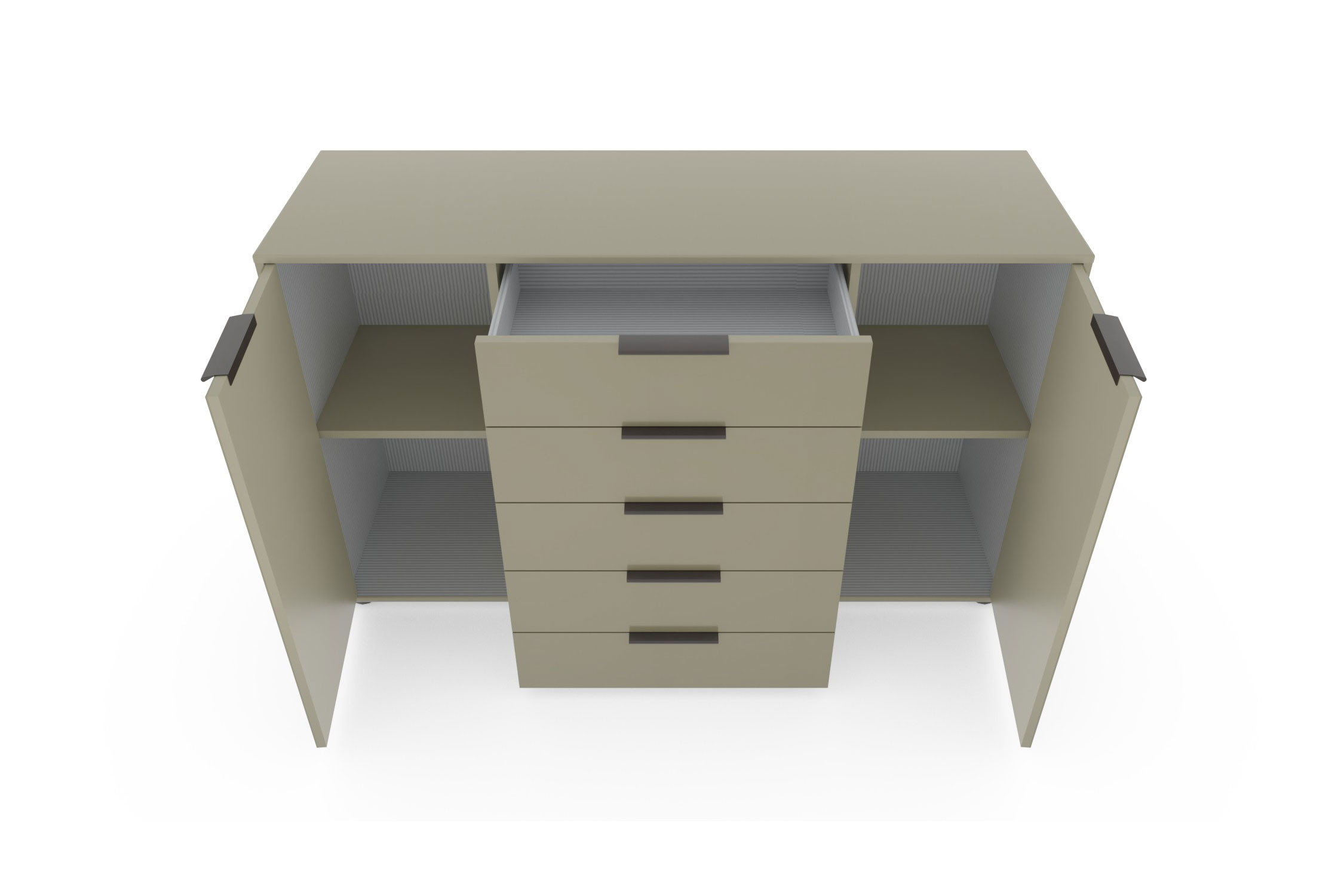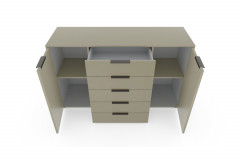 - Kommode: links 1 Tür (Anschlag links), rechts 1 Tür (Anschlag rechts), hinter den Türen je 1 Einlegeboden, mittig 5 Schubladen