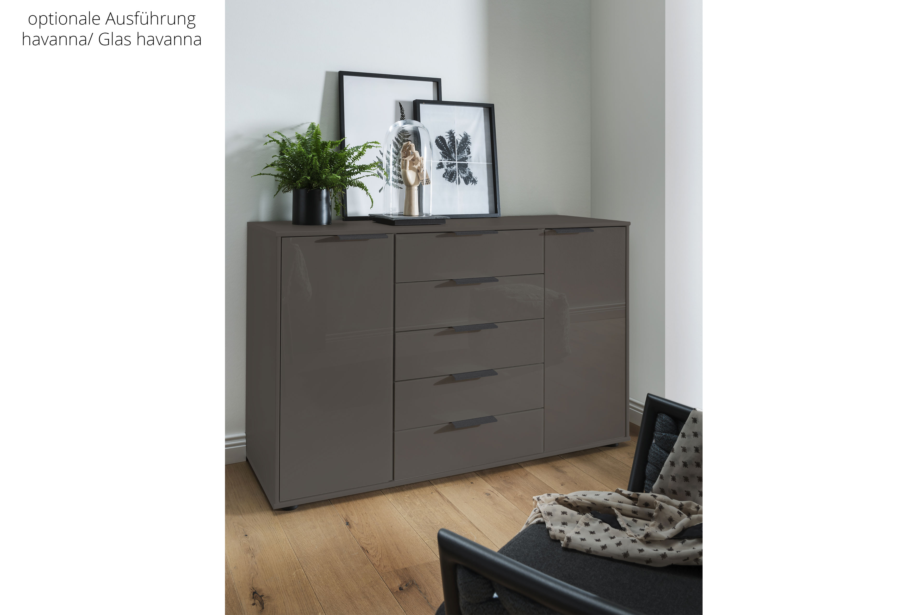 Die Wiemann Kommode aus dem Schlafzimmer-Programm Parma vereint ein modernes Design-Konzept mit praktischer Funktionalität. Mit ihrem Gesamtmaß von ca. 141 x 86 x 43 cm bietet sie ausreichend Stauraum für all Ihre persönlichen Dinge und kann sowohl im Schlafbereich als auch im Wohn- oder Esszimmer ihren Platz finden. Sie verfügt über zwei Tür-Abteile, die mit je einem Einlegeboden als zweckmäßige Unterteilung aufwarten, und fünf breite Schubladen, die sich mittig befinden. Das Sideboard ist in drei verschiedenen Farben erhältlich, Kieselgrau, Champagner und Havanna, wobei der Korpus und der Oberboden als Dekor und die Kommoden-Fronten mit einer farbigen Glasauflage erscheinen. Wählen Sie über die angebotenen Zusatzoptionen Ihre Wunsch-Farb-Kombination, um das neue Möbelstück bestmöglich an Ihre bereits vorhandene Einrichtung anzupassen. Im Typenplan, der Ihnen unter Downloads zur Ansicht zur Verfügung gestellt wurde, finden Sie alle Schlafzimmer-Möbel und Zubehör-Elemente der Serie Parma von Wiemann. Unsere Einrichtungsexperten nehmen Ihre individuellen Bestellwünsche für Einzelmöbel und Möbel-Zusammenstellungen auch gern telefonisch oder via Kontaktformular entgegen.