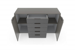 - Kommode: links 1 Tür (Anschlag links), rechts 1 Tür (Anschlag rechts), hinter den Türen je 1 Einlegeboden, mittig 5 Schubladen