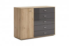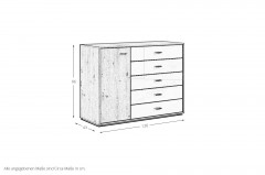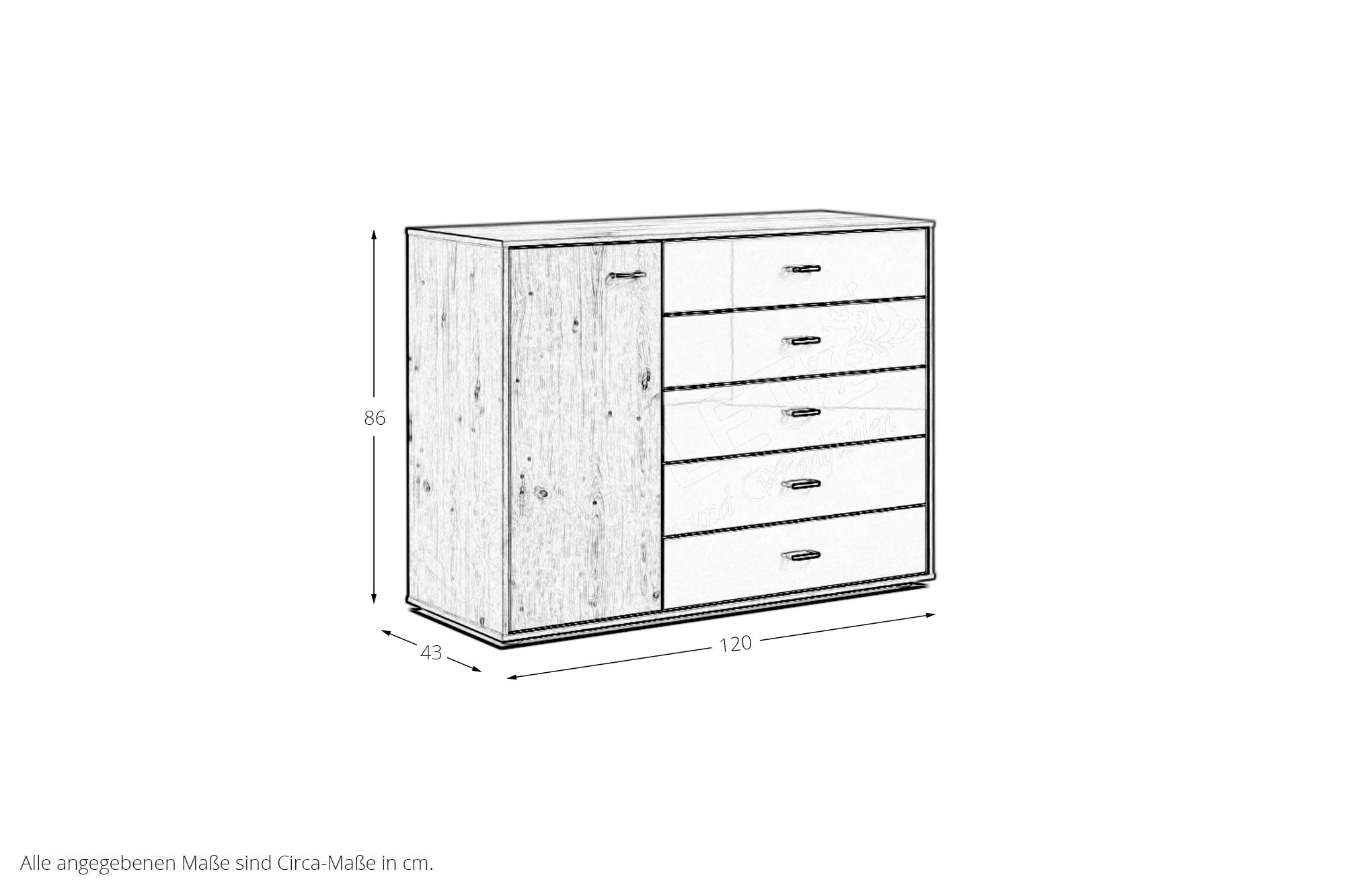 - Kommode: rechts 5 Schubladen, links 1 Tür (Anschlag links), dahinter 1 Einlegeboden