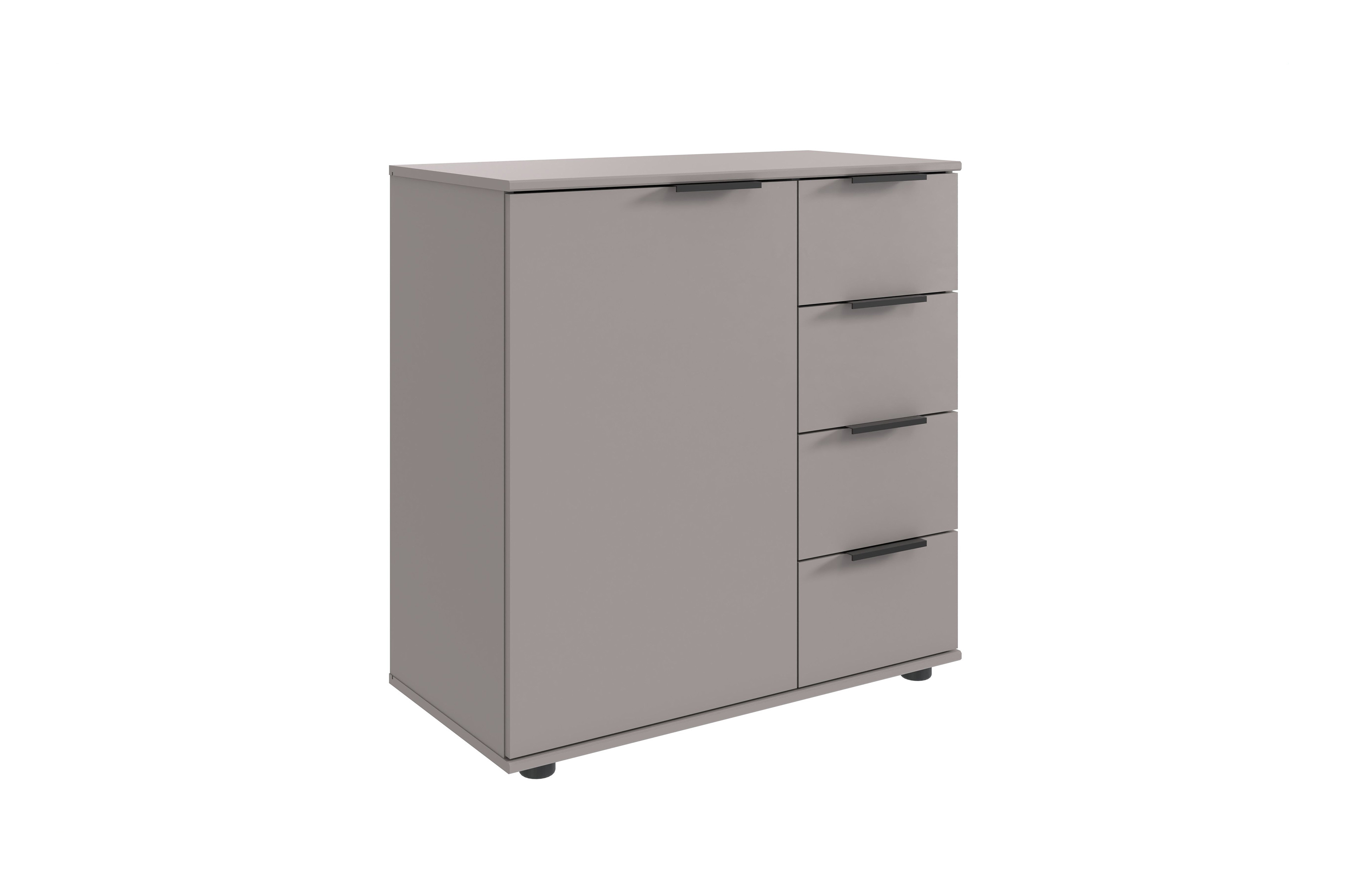 Die Kombikommode Tilburg von Wimex verbindet modernes Design mit praktischem Nutzen. Mit einer Breite von ca. 81 cm und einer Höhe von ca. 83 cm passt Tilburg in nahezu jeden Raum, ohne aufzutragen und schenkt Ihnen in zwei eleganten Farben ein harmonisches Ordnungskonzept. Auf der linken Seite befindet sich eine Tür, die den Raum dahinter mit einem Fachboden in zwei Fächer unterteilt. Rechts finden Sie vier kompakte Schubkästen, die Kleinteile, Schmuck oder Bürobedarf übersichtlich an Ort und Stelle bündeln. Die Wahl zwischen den Farbausführungen Saharagrau und Grafit sorgt dafür, dass Tilburg sich nahtlos in Ihre bestehende Einrichtung einfügt. Beide Varianten wirken warm und zugleich modern. Die Kommode von Wimex passt sich Ihren Wünschen an und zeigt sich als vielfältiges Möbelprogramm, das sich in vielen Räumen einsetzen lässt. Nutzen Sie den Konfigurator, um weitere Möbelstücke aus der gleichnamigen Kollektion zu entdecken und Ihr Schlafzimmer, Flur oder Wohnzimmer mit Tilburg zu verschönern. Tilburg von Wimex – für ein schönes Wohlbefinden Zuhause ...